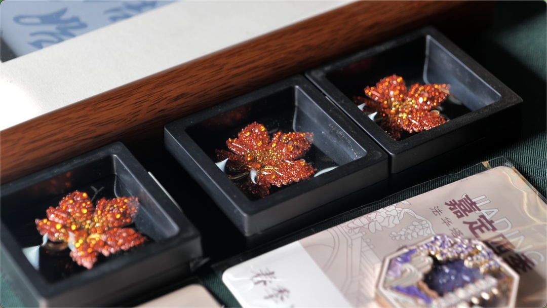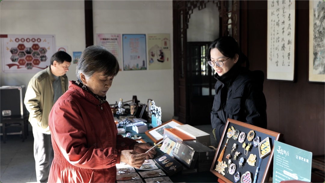 穿过熙攘的人群,记者发现,今年的秋霞圃不仅有静赏枫景的诗意,还多了几分“热闹的仪式感”。走进三隐堂,“嘉有好店”快闪店里“宝藏”琳琅满目,嘉定系列冰箱贴、纸雕本、非遗盘扣……古朴空间里摆满各类嘉定特色的文创周边,处处透着巧思。