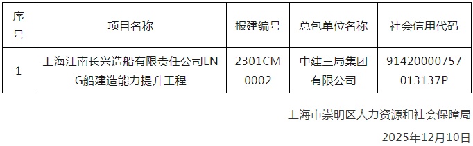 根据《工程建设领域农民工工资保证金规定》《贯彻实施办法》相关规定,现对以下工程项目申请返还农民工工资保证金情况进行公示。如发现其存在拖欠农民工工资行为的,请及时携带有关证据材料到上海市崇明区人力资源和社会保障局执法部门受理窗口投诉举报。 公示期满,如不存在工资拖欠问题投诉举报的,上海市崇明区人力资源和社会保障局将按规定程序返还农民工工资保证金。 公示时间:2025年12月10日-2026年1月8日 公示期间欠薪线索反映电话:021-69693061 投诉举报地址:上海市崇明区城桥镇朝阳门路11号403室