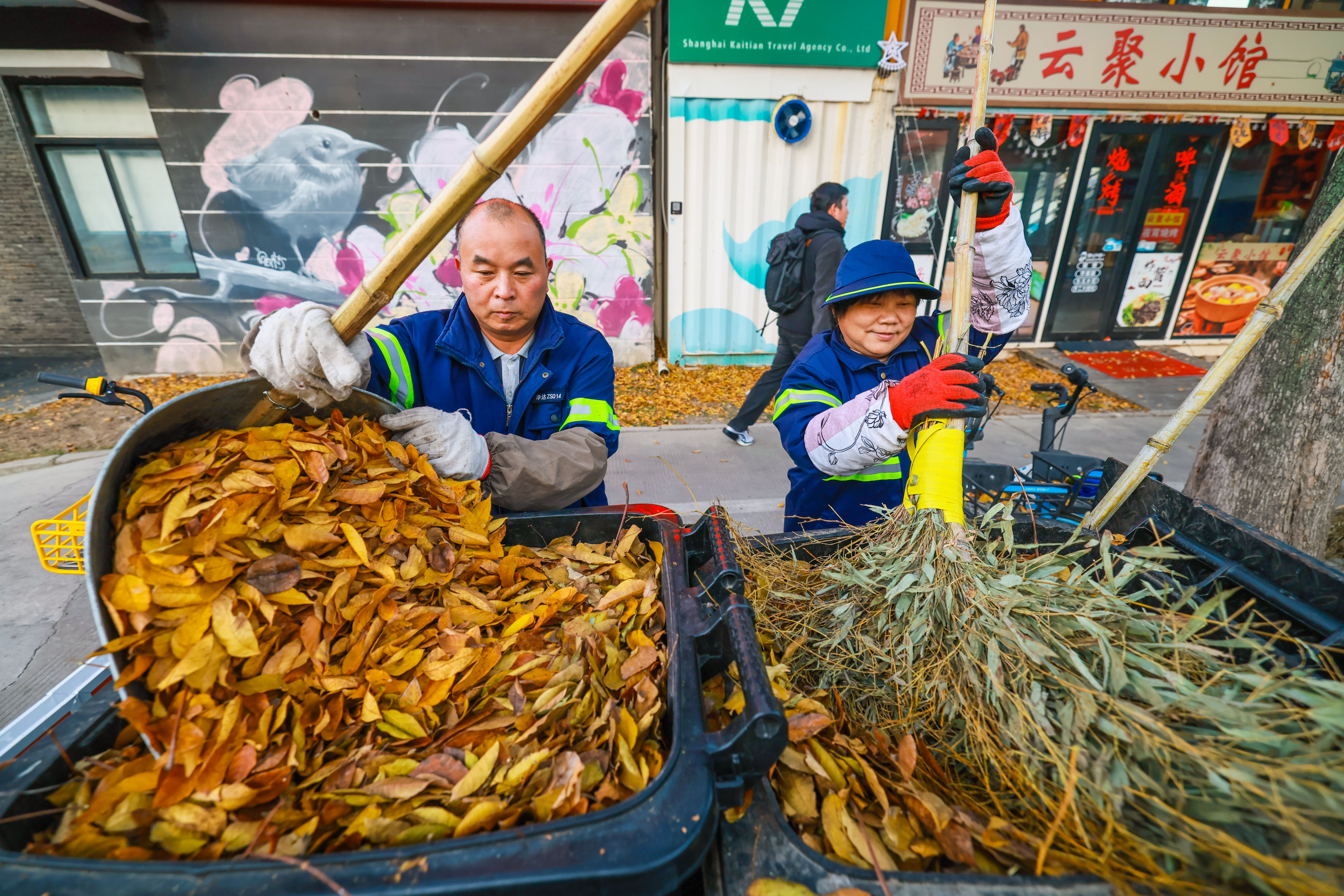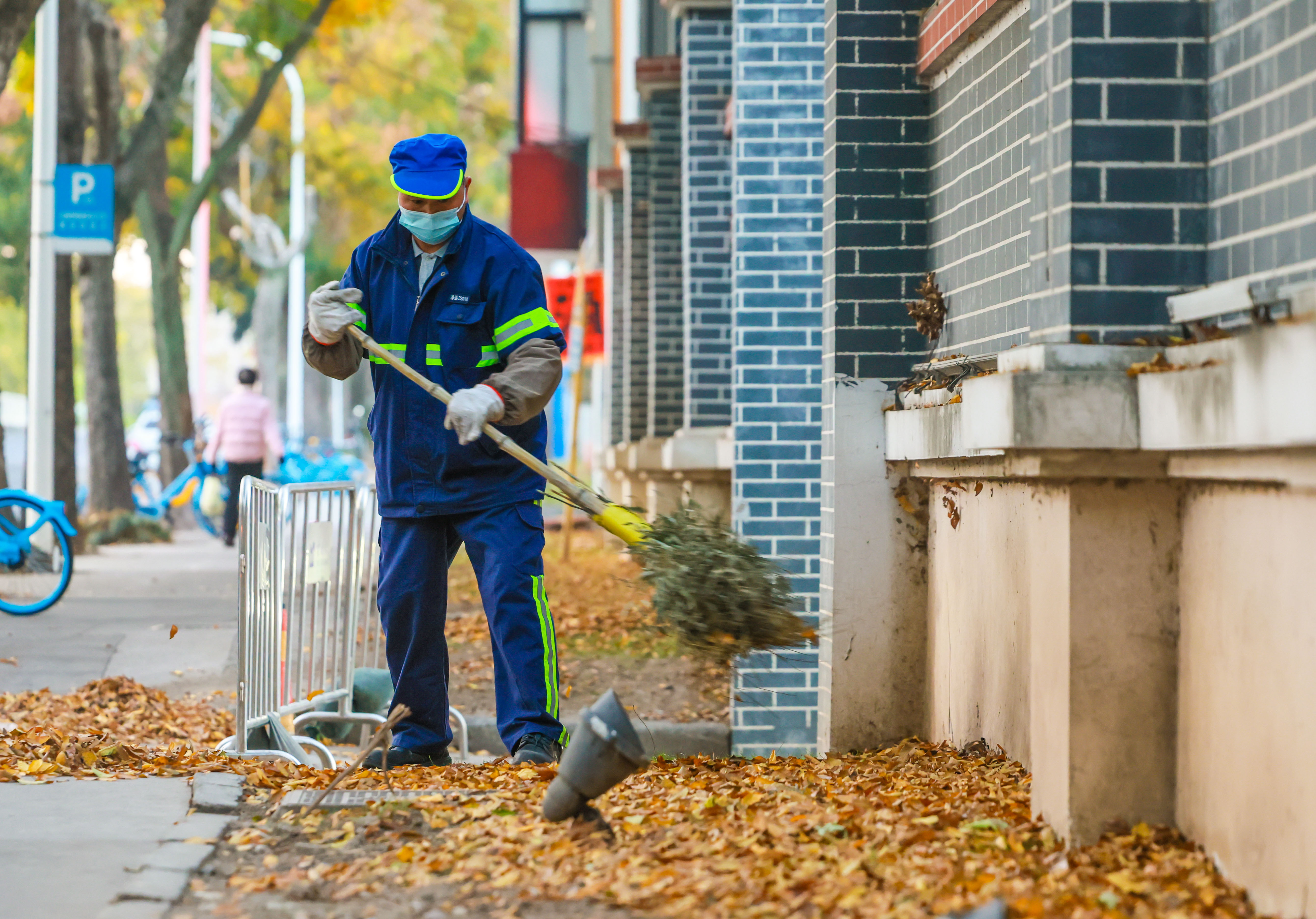 清晨7时,晨光漫过商铺招牌时,堆积的落叶已被清理干净,只剩零星叶片缀在人行道缝隙。这群“清晨守护者”扛起满袋落叶,转向下一段待清扫的街区——他们的忙碌,让松江的秋晨既留住了落叶的诗意,更守住了街巷的清爽整洁。