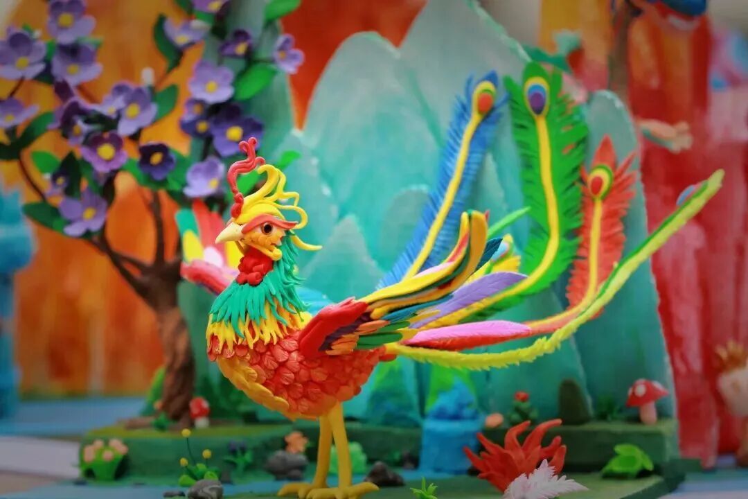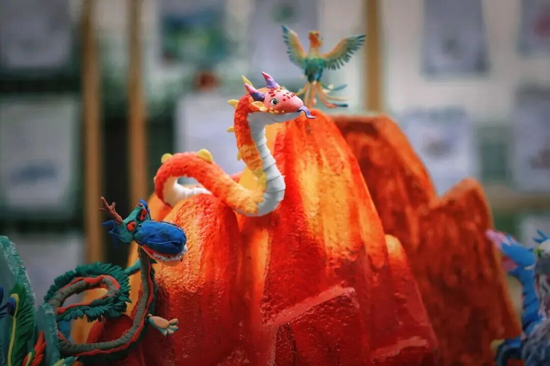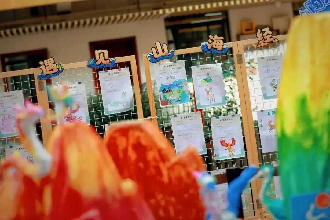 三四年级的“山海经秘境”则充满了探索的乐趣。学生用陶泥复原了《山海经》中的神兽世界,使抽象的文本变为具象的陶艺品,古老的神话仿佛触手可及。更妙的是,小创作者们还化身“秘境守护者”,引导参观者使用他们绘制的“寻宝密卷”,在展区中寻找对应的奇珍异兽,完成一场跨越古今的文化寻踪。