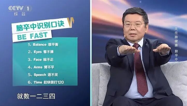 脑卒中也叫脑中风、中风,分为出血性卒中和缺血性卒中,是急性脑血管病的一种。是由于脑血管突然发生破裂或堵塞,导致脑组织损伤而发生的一种疾病。 脑卒中“四高”特点 高发病:在中国,每年新发脑卒中病例约有250万人,每20秒左右,就有一人死于脑卒中。 高复发:脑卒中容易复发。 高致残:是中国成人第一致残原因。 高死亡:是中国全人群的第一死亡原因,有1/5的人最终死于卒中。 图源:CCTV生活圈 提醒: 大脑额叶发生卒中:失语、人格改变、说话没有逻辑。 大脑顶叶发生卒中:无法分辨方位、无法画图像、无法阅读、无法听懂音乐。 大脑颞叶发生卒中:记忆力下降、语言无法理解。 大脑枕叶发生卒中:看不清事物。 小脑发生卒中:无法掌握平衡。 脑干发生卒中:危及生命。 脑卒中识别口诀 难平衡:走路时难以保持平衡,就像喝醉酒一样,向一侧倾倒。 看不清:眼睛看不清或者看东西有重影。 脸不正:正常情况下,我们的两个鼻唇沟应该是对称的,如果不好判断,可以对着镜子笑一笑,帮助判断脸是否对称。 臂不平:两只手平伸、前伸,坚持10秒钟,看力气是否一致,是否有单侧胳膊无力的情况。 语不灵:是否能听懂别人说话,自己说话是否有表达不清的情况。 赶快拨打120:一旦发生以上5个症状中的任何1个,就要警惕脑卒中,立刻拨打“120”急救电话进行求救,尽快到医院进行救治。 图源:CCTV生活圈 提醒: 随着科技发展,人工智能等新技术也在脑卒中救治中发挥着重要作用,比如将溶栓时间窗延长等,所以对于脑卒中患者,尽快到达医院是非常关键的,千万不要“等一等”。 远离脑卒中小贴士 脑卒中“四高”特点 高发病、高复发、高致残、高死亡。 脑卒中危险因素 年龄、性别、家族史、种族、高血压、高血糖、高血脂、吸烟、季节因素等。 脑卒中识别口诀 难平衡、看不清、脸不正、臂不平、语不灵,赶快拨打120。 做好这6件事 帮你离脑卒中远一点 控制好血压、血糖、血脂,戒烟戒酒,饮食均衡,规律运动,早睡早起不熬夜,保持好心情。