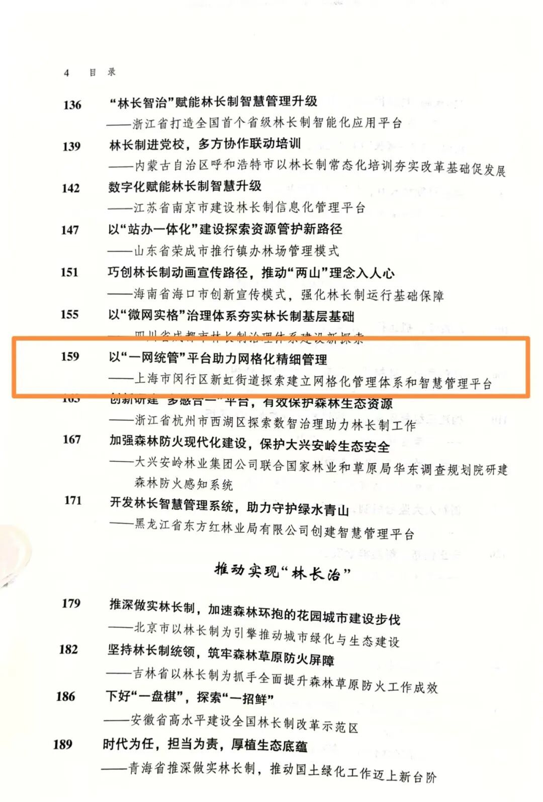 近日,国家林业和草原局林长制工作领导小组办公室编制的《从“林长制”到“林长治”——全国林长制改革典型案例集》正式出版。该书聚焦强化履职尽责、创新协作机制、细化监督考核、完善基础保障等五个主题,精选全国林长制改革典型案例70个,其中闵行区报送的《上海市闵行区新虹街道以“一网统管”助力林长制网格化精细管理》案例入选。