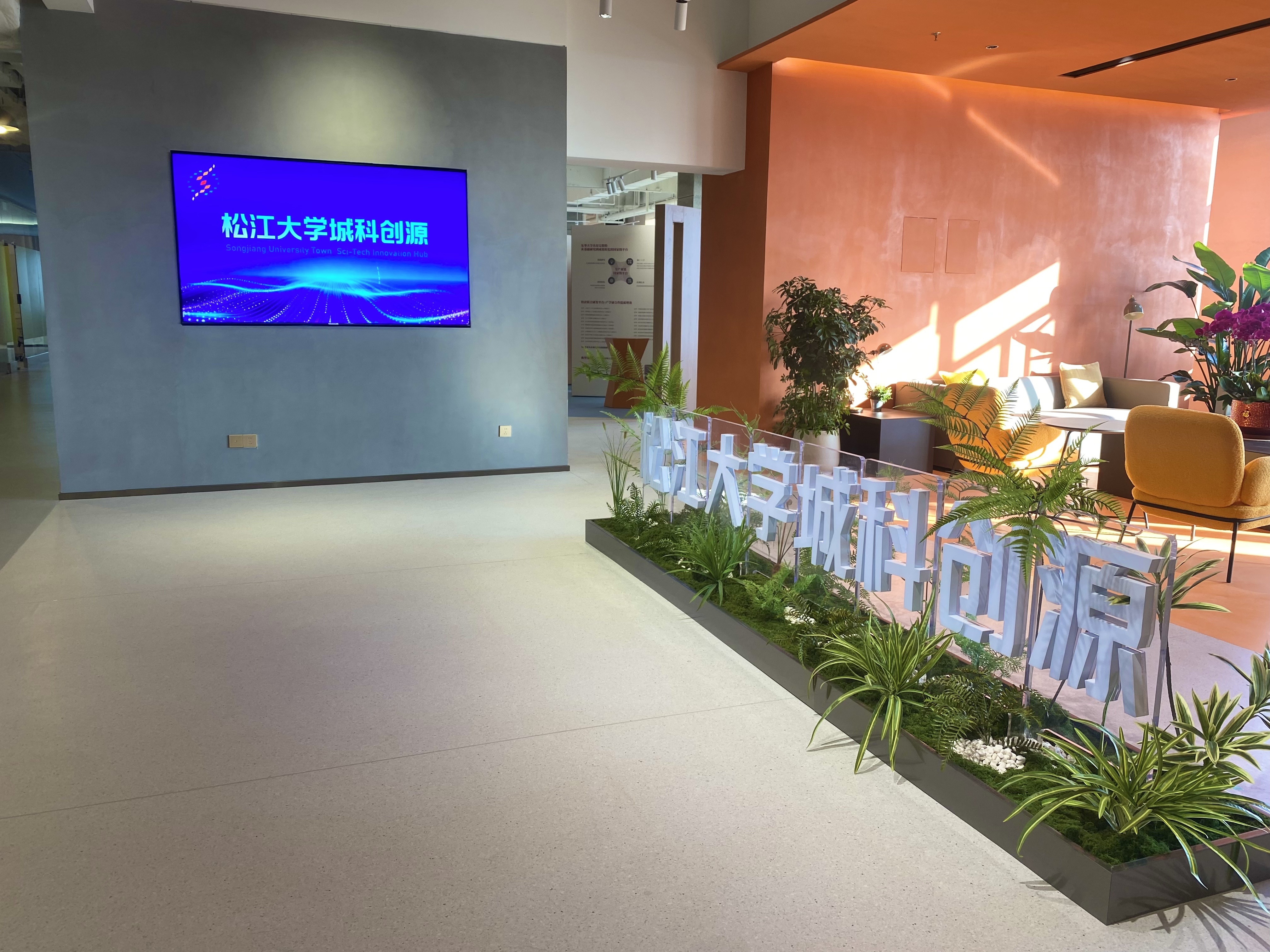 松江大学城科创源综合赋能中心位于文汇路699号上海视觉艺术学院德稻大师楼11层,这里的开放式空间设计以“水”寓智汇、“树”喻成长,风格现代而活泼。约1200平方米的区域内,导引服务区、政务服务区、高校赋能区、共享创新区等功能区块清晰分布。