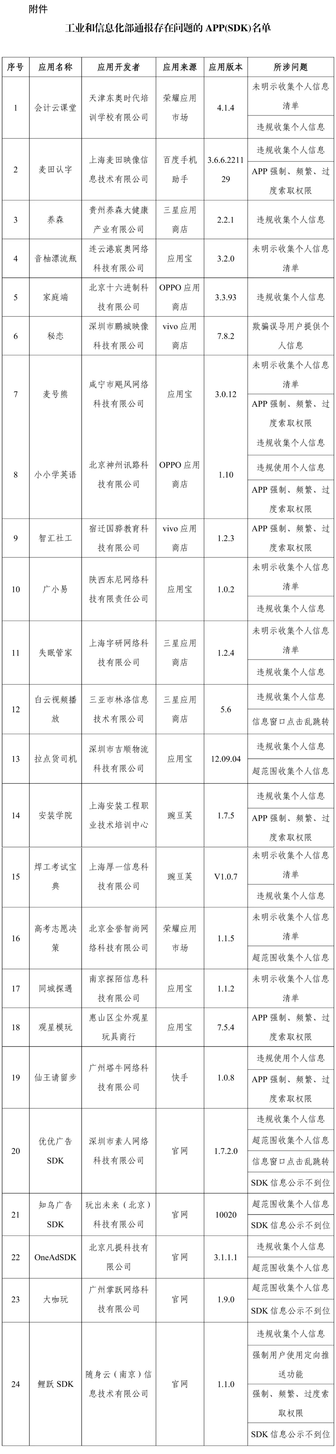 工信部对APP、SDK违法违规收集使用个人信息等问题开展治理。近期,经组织第三方检测机构进行抽查,共发现24款APP及SDK存在侵害用户权益行为,现予以通报。详见↓