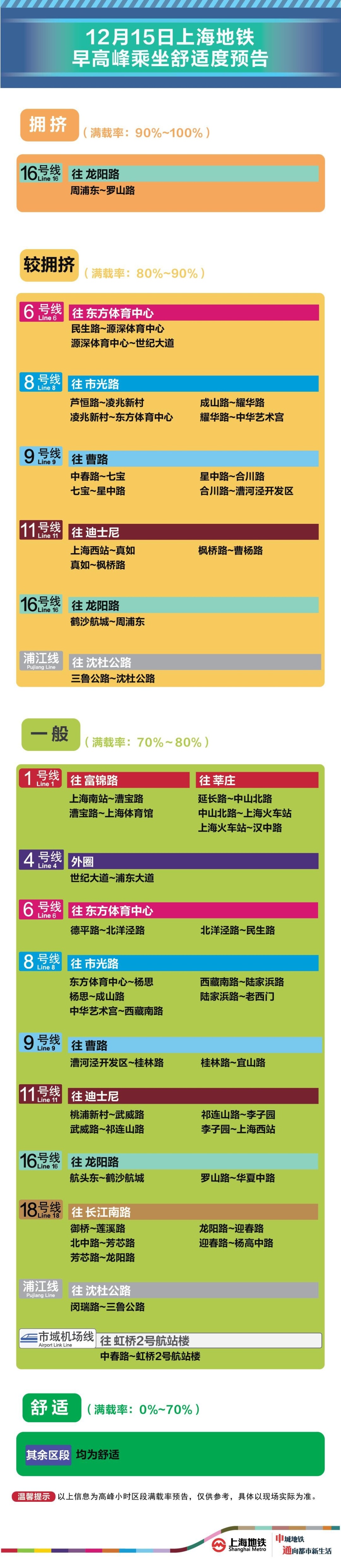 为提升上海地铁早高峰期间出行服务水平,提升乘客乘坐体验,上海地铁向乘客提供乘坐舒适度预告,方便乘客提前做好出行准备。