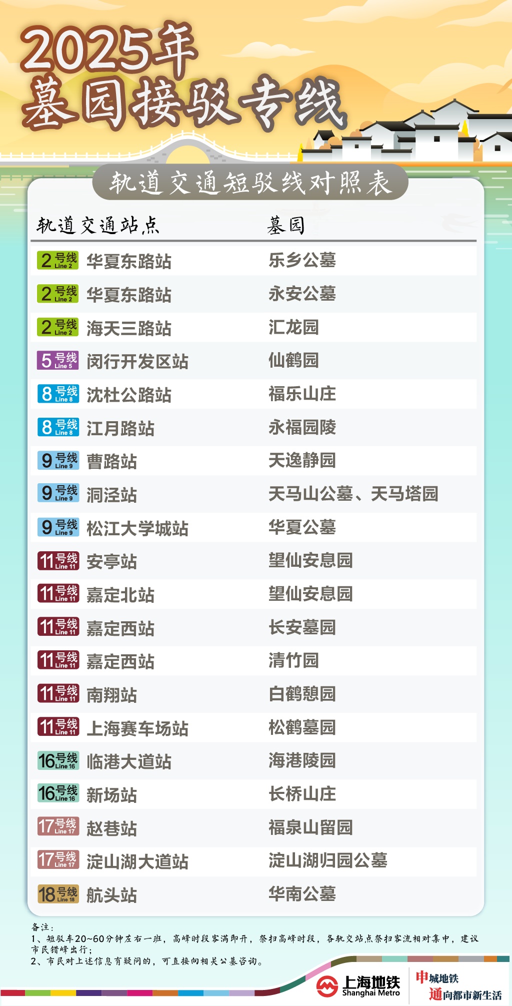 2025年冬至即将来临,本市又将迎来冬至扫墓季。上海地铁制定“2025年冬至运营组织方案”,涉及全网8线( 2、5、8、9、11、16、17、18号线)18站,并继续配合 “轨道交通+公交短驳”举措,做好运力和服务准备,积极应对出行大客流,满足祭扫交通需求。