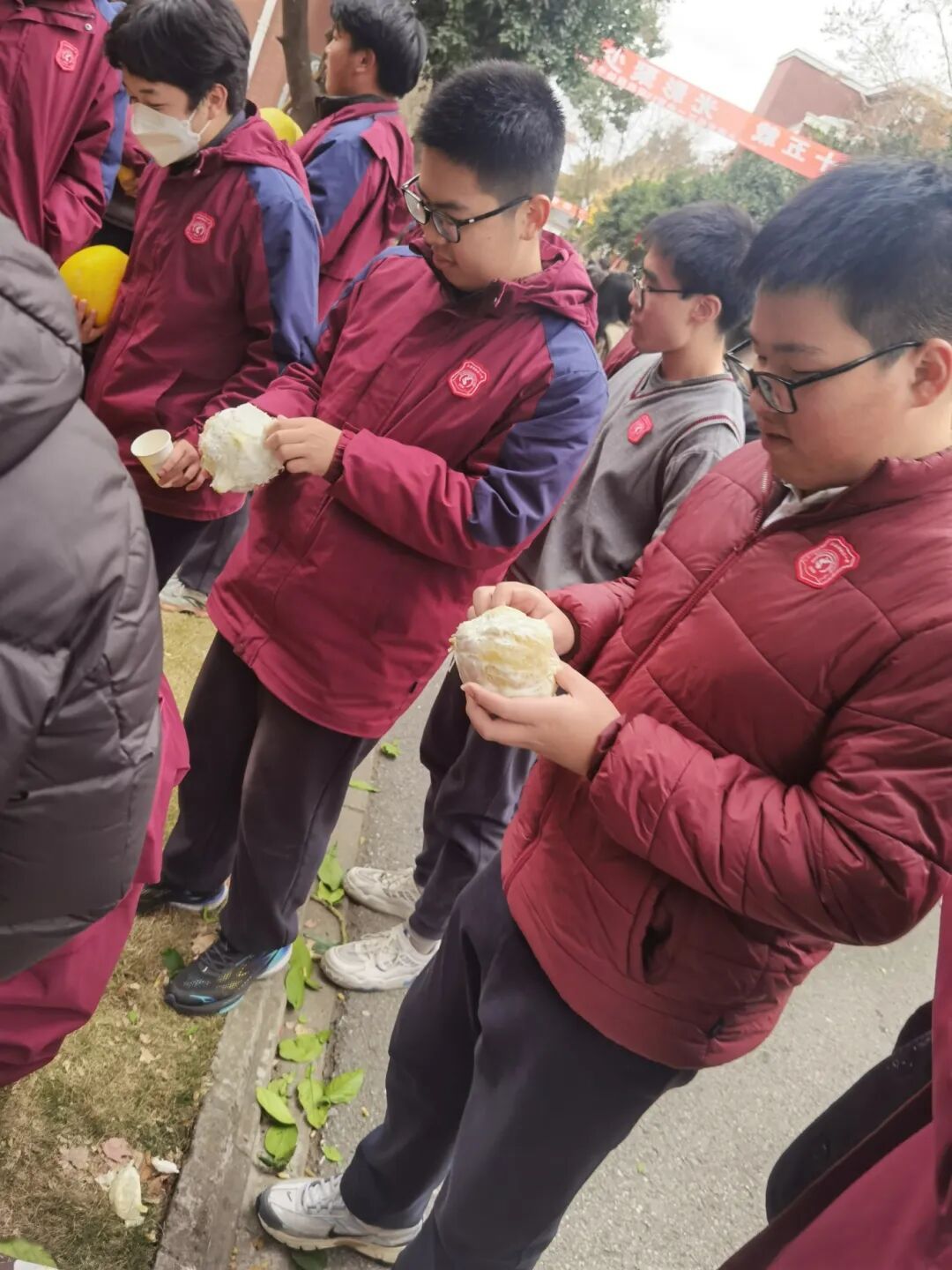 “今年的柚子很好吃,我要再去拿一个!”一位高二的男生说,去年的柚子没什么味道,想不到今年的这么好吃。柚子树下,满是扎堆分吃柚子的学生,柚子的香味在校园里弥漫。除了柚子,学校跟往年一样还熬煮了柚子茶,校友提供了蛋糕,“我可能今天晚饭都不用吃了!”