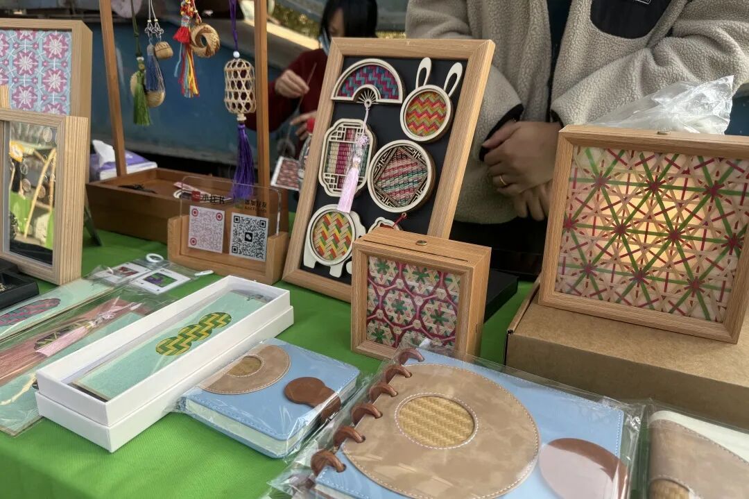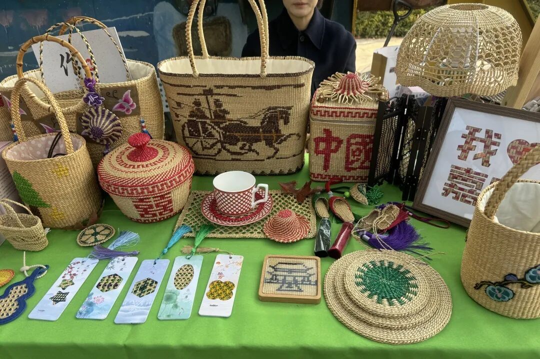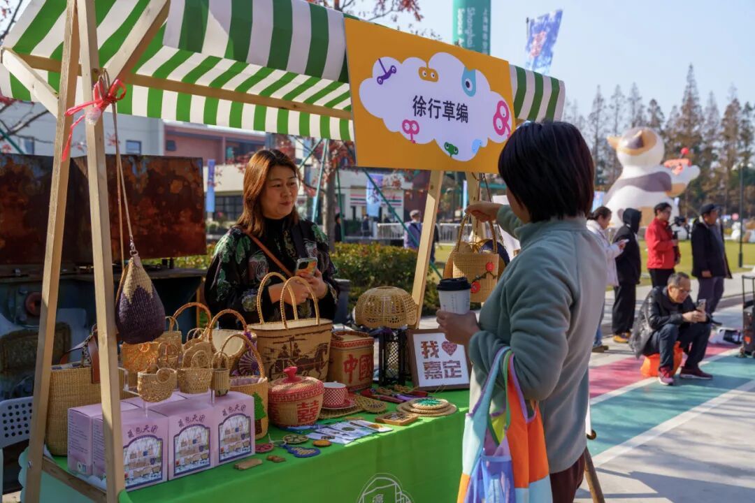 徐行草编摊位上的包包、挂件、杯垫等产品深受男女老少的喜爱,兼具手工织品的自然美、艺术美和实用价值,是属于中国自己的国潮大牌。