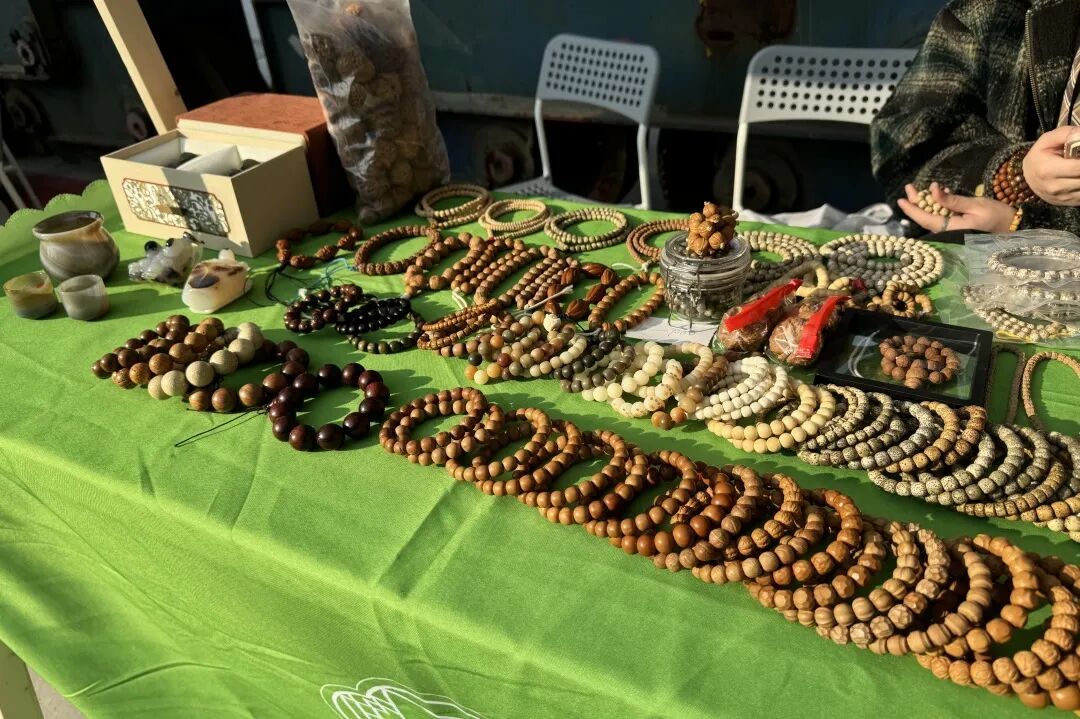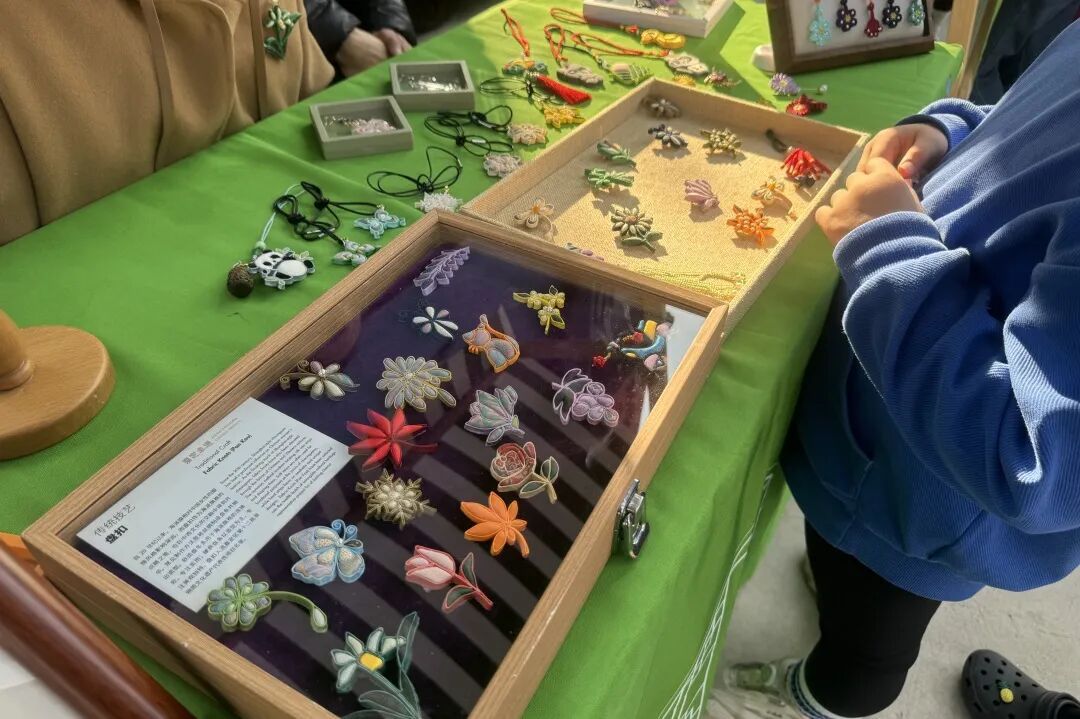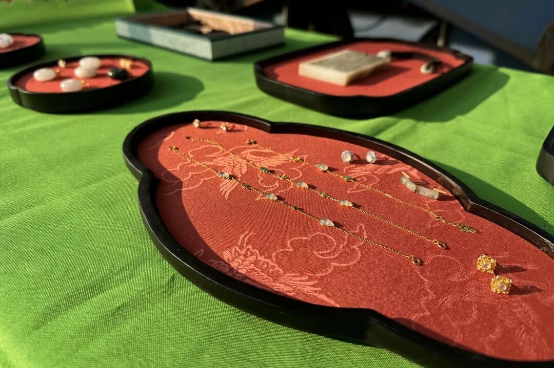 压金丝嵌宝工艺盛行于清代乾隆年间。是以玉器为载体,用金丝镶嵌法将玉固定在其表面,在青铜器、玉器、木雕等行业都有使用,本次带来了精美的翡翠手链、玉石挂坠,给市集增添了一抹文雅的底蕴。