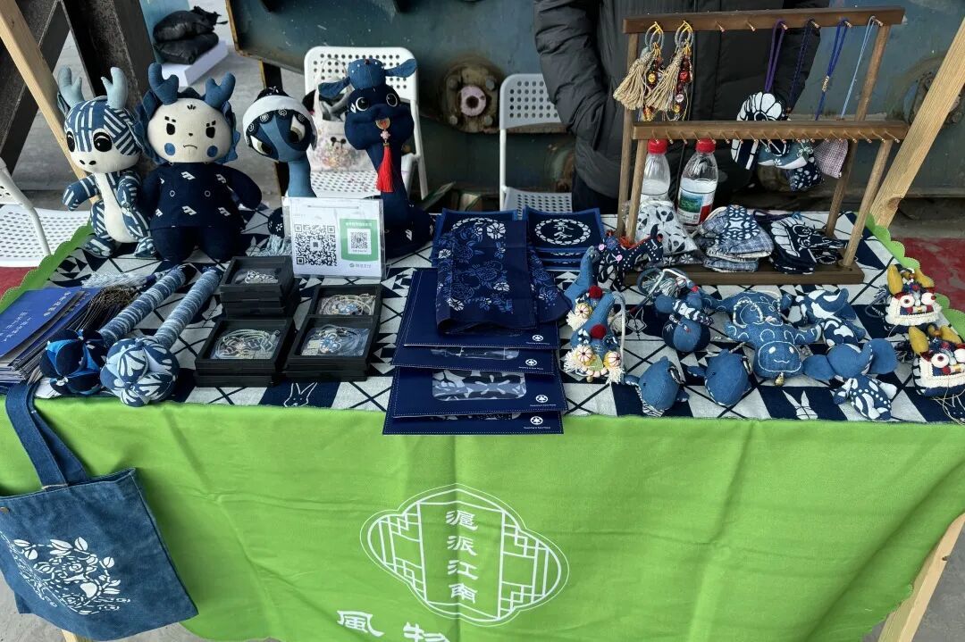 安亭药斑布始于南宋,用镂空版白浆防染印花,以蓝草为染料,经过刻版、刮浆、浸染、去白多道印染工艺制成。这次带来了蛇年限定玩偶、养身锤、帆布包等众多产品,丰富的纹样里寄托着美好的寓意。
