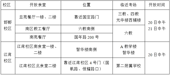 1.考试日中午,考生可到考点周边商圈用餐,也可在校内部分食堂用餐。校内食堂开放情况如下: