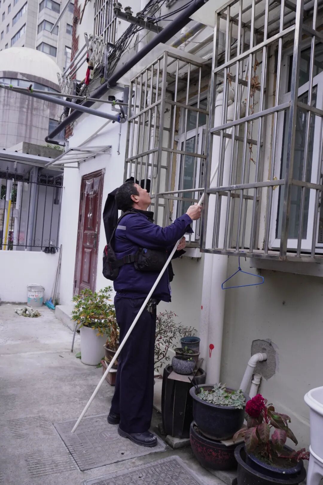 物业工作人员在清理垃圾、维修管道
