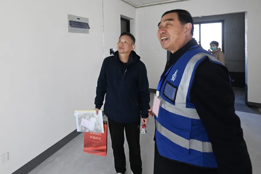 记者在现场看到,该安置社区建筑外立面洁白明快,内部绿化环境优美宜人,配套设施完善清晰,老金对此非常满意,说这样品质的小区感觉并不比商品房社区要差。他选择的房屋位于15楼,房间设计合理、南北通透、采光也非常好。负责验房的工作人员为老金夫妇详细介绍了房屋的情况,并逐一查验了水电等情况。