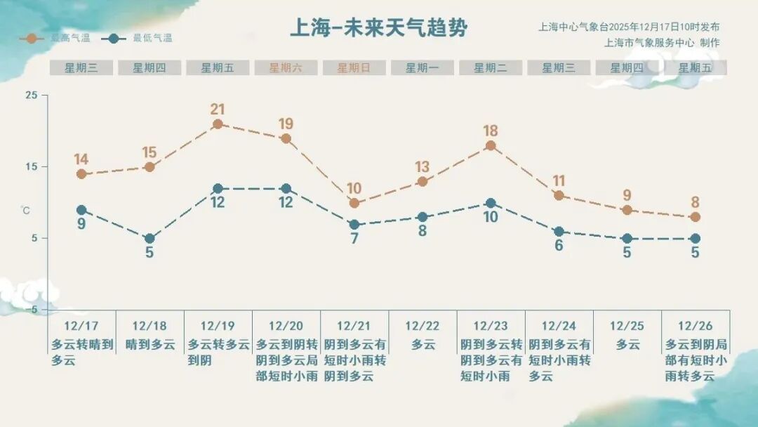 上海中心气象台预计,明天天气延续今日天气格局,周五气温登达“回暖高峰”,届时将迎来“小阳春”的温暖体感。受冷暖空气交汇影响,周六本市局部地区将会迎来短时小雨。随着新一股冷空气即将抵沪,本周日风力将有所增大,气温也将同步下降。气温波动将会带来多变体感,请市民们及时关注最新报道、灵活调整着装。此外未来数日天气依旧干燥,注意及时补水的同时还请保障用火用电安全。