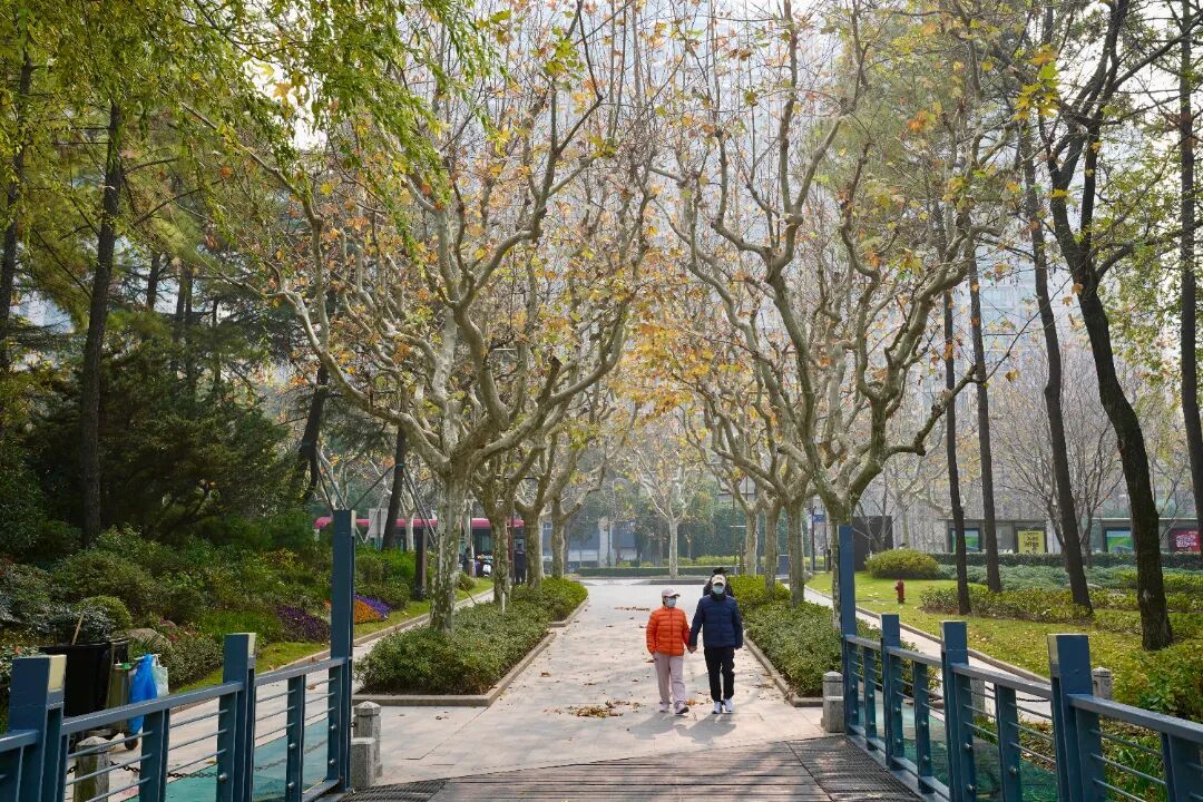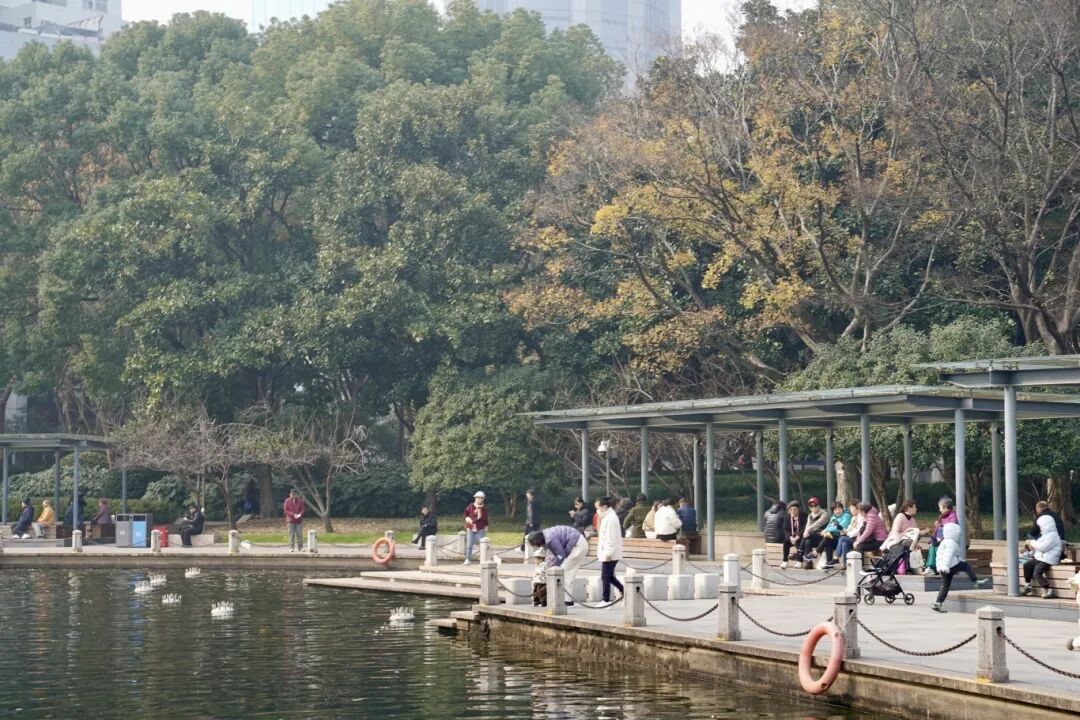 上午十点,徐家汇公园游客络绎不绝,阳光熹微照耀林荫,为出行带来微暖的体感。汇金湖畔,市民们或是安坐闲侃家常,或是欣赏岸畔光景,薄雾未散,为远处的楼宇带来朦胧的观感。园中梧桐迎来了四季流转中华丽的转变,在公园常青草木的映衬下,梧桐枝叶层层叠叠、色彩不一。