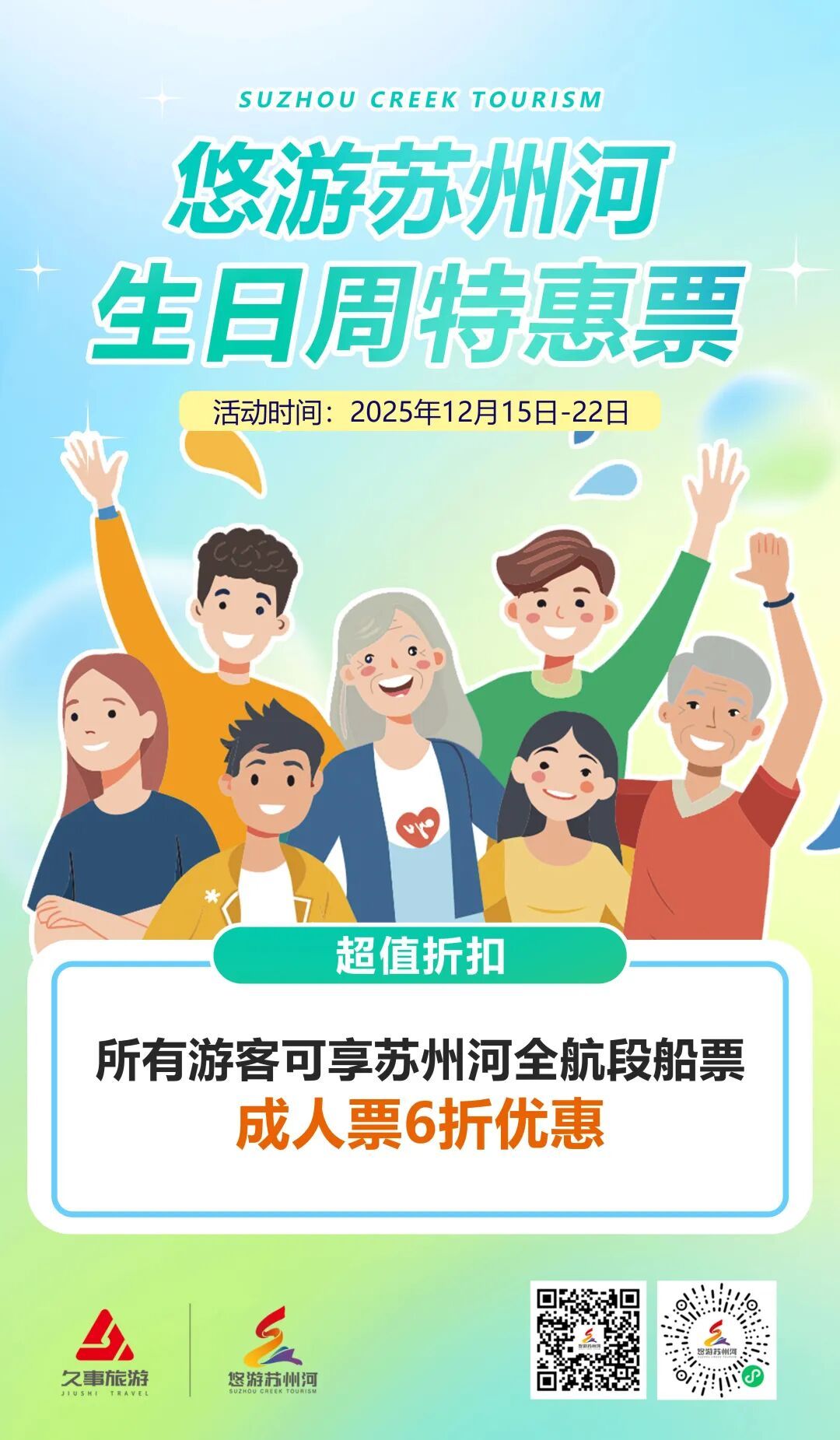 “悠游苏州河”此次推出三周年限时回馈:活动期间,除演艺、餐饮等主题航班外,全航段成人票均享6折优惠。以30分钟航线为例,原价60元,优惠后仅需36元。市民可通过“悠游苏州河”微信小程序便捷购票。