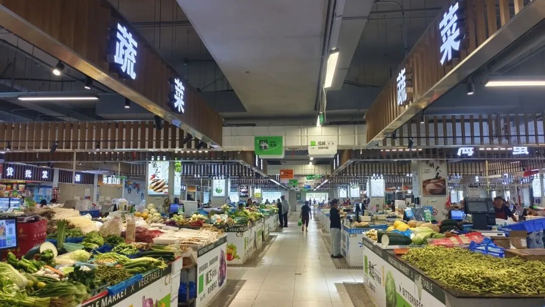 一是品类分区管理。明确蔬菜、肉类、水产、干货等区域,蔬果区用斜制钢架台面(省空间、便储物),水产区设玻璃鱼缸+独立杀鱼台+内侧排水(防积水、保干爽)。同时在主通道电子大屏以及出入口墙面,线上线下展示菜市场分类平面图,为进入菜市场买菜的消费者进行精准指引;二是稳品质扩特色。在老菜场搬迁过程中,多次召开商户座谈会听取意见,保留老菜场优质商户,确保供应品质,同时优先引进货源稳定、口碑好的商户,共设219个摊位,经营214个,入驻商户134户,招商率达97.7%。三是跨界合作共赢。与菜市场门对门的盒马奥莱店进行错峰经营,利用菜市场早市菜品新鲜以及虾、鱼、蟹等水产类品类优势,与盒马业态进行错位配置、共享客流、互补需求,实现菜市场与生鲜超市的合作共赢,更好满足市民百姓家门口“一站式”购物新需求。