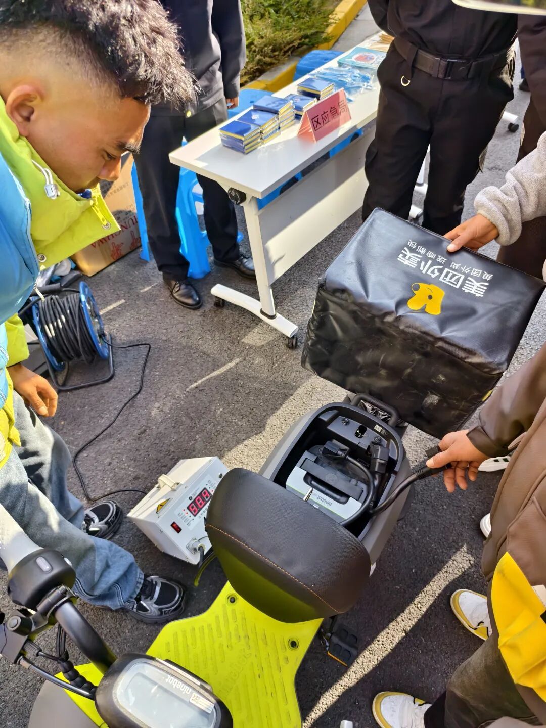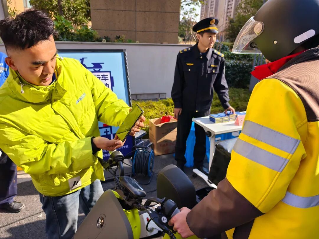 活动现场,评估人员使用专业设备对小区居民、快递员、外卖员使用的电动自行车电池进行免费专业评估,并就日常使用及更换提供针对性建议。