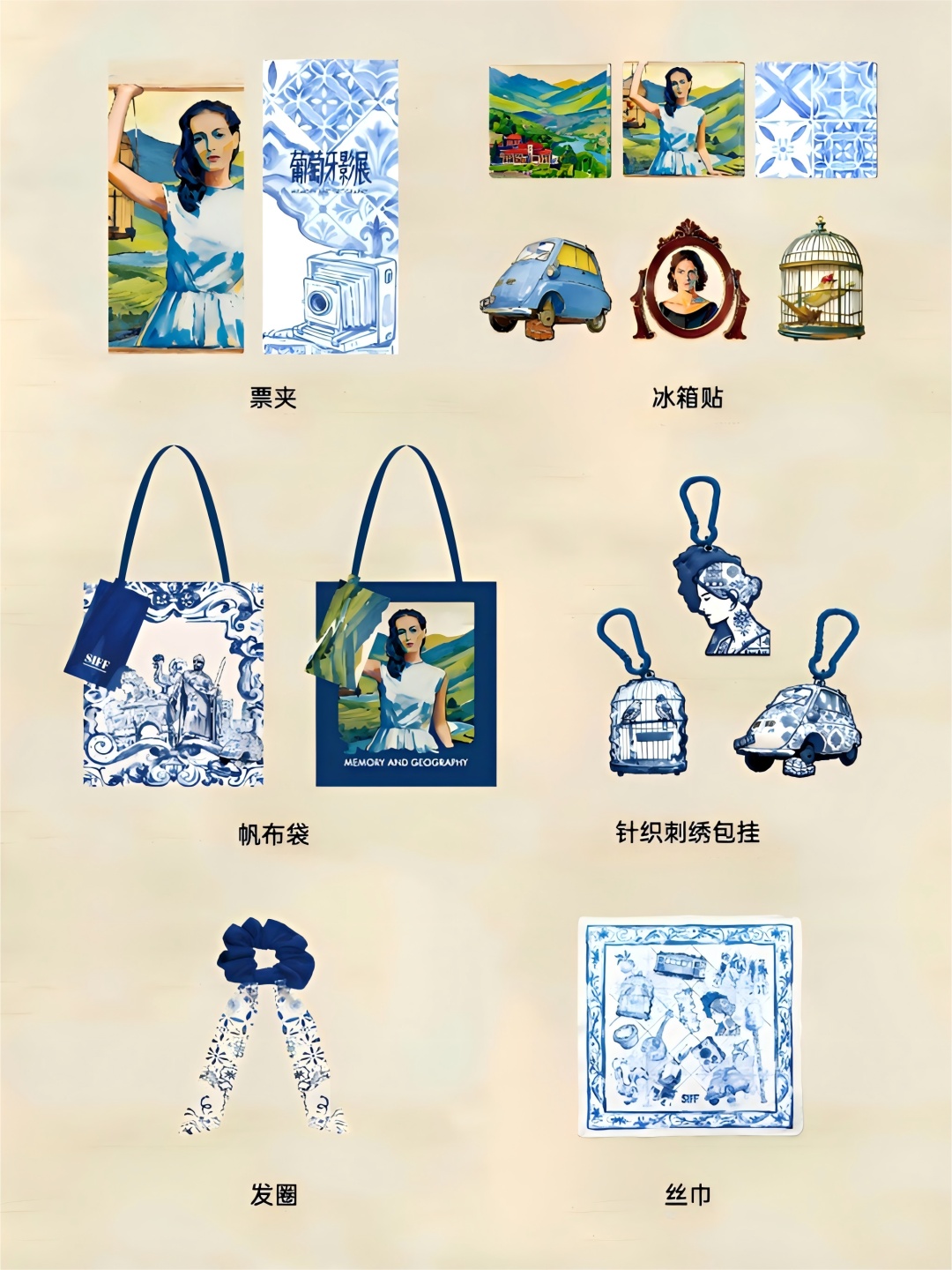 影展系列产品呼应影片关键元素,注重实用功能,更从“记忆与地理”的影展主题中汲取灵感,巧妙融贯葡萄牙Azulejo彩绘瓷砖风格和地中海的斑斓景致。不仅有SIFF文创“明星产品三件套”设计更新,包括2款票夹,6款冰箱贴,以及2款帆布袋;还有海报、针织刺绣挂、丝巾与真丝发圈等品类(其中海报与真丝发圈仅限线下销售)。