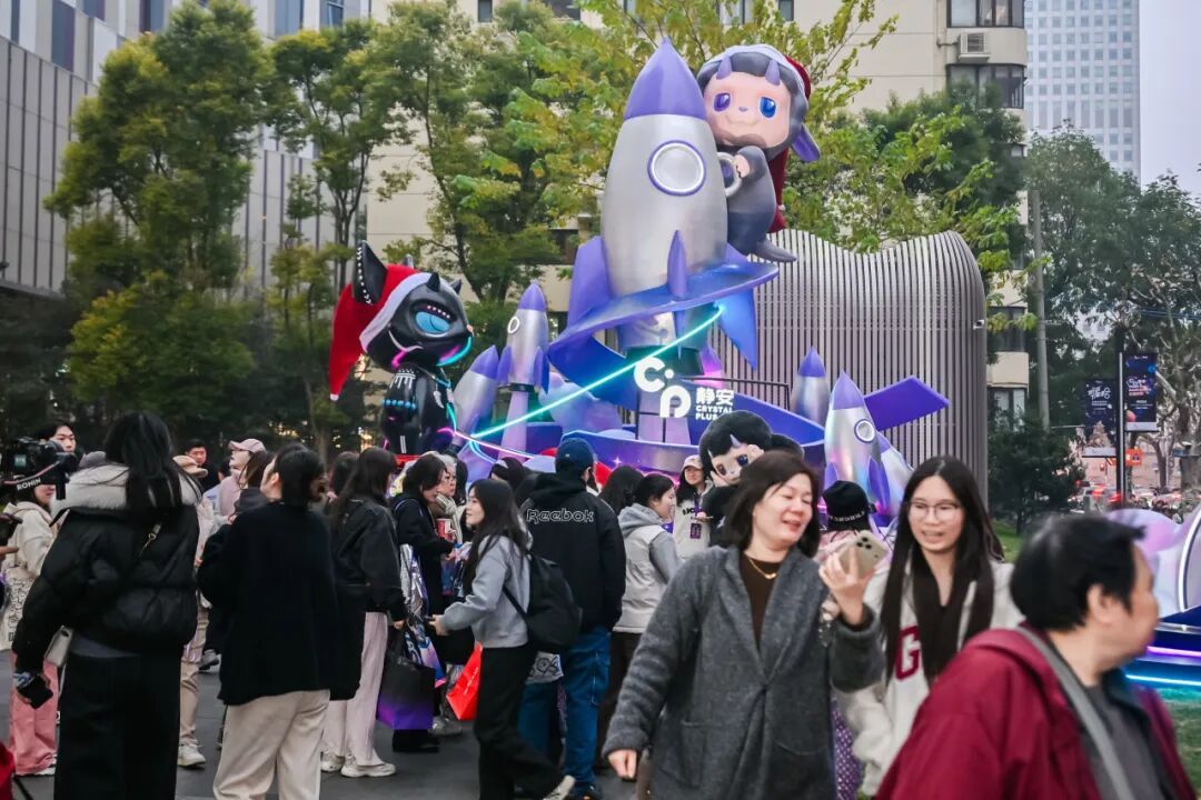日前,一座8米高巨型“火箭”已亮相愚园路户外草坪,颠覆传统节日景观,成为瞩目的城市新地标;D.FA.MILY家族成员“小D”“小恶魔”与“小煤球”以多种艺术形态惊喜现身商场内外,从屋顶巨型气膜到中庭梦幻场景,构建出沉浸式的打卡空间;更特别设置梦幻摇摇木马等互动装置,邀请顾客共赴一场童趣之旅。