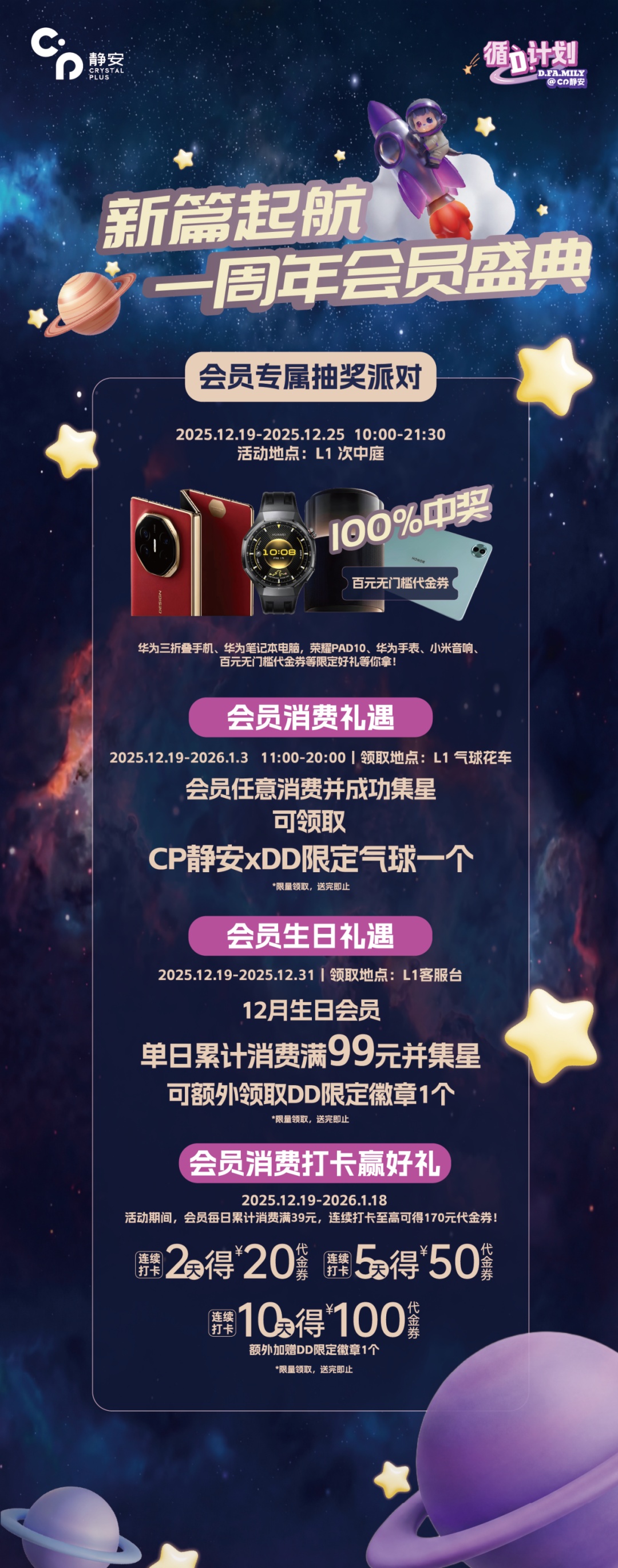 一周年,CP静安以满载礼遇暖心回馈。会员专属抽奖豪礼派送、节日限定礼赠、消费打卡赢代金券、万象星圣诞好礼限时兑——多重惊喜叠加。