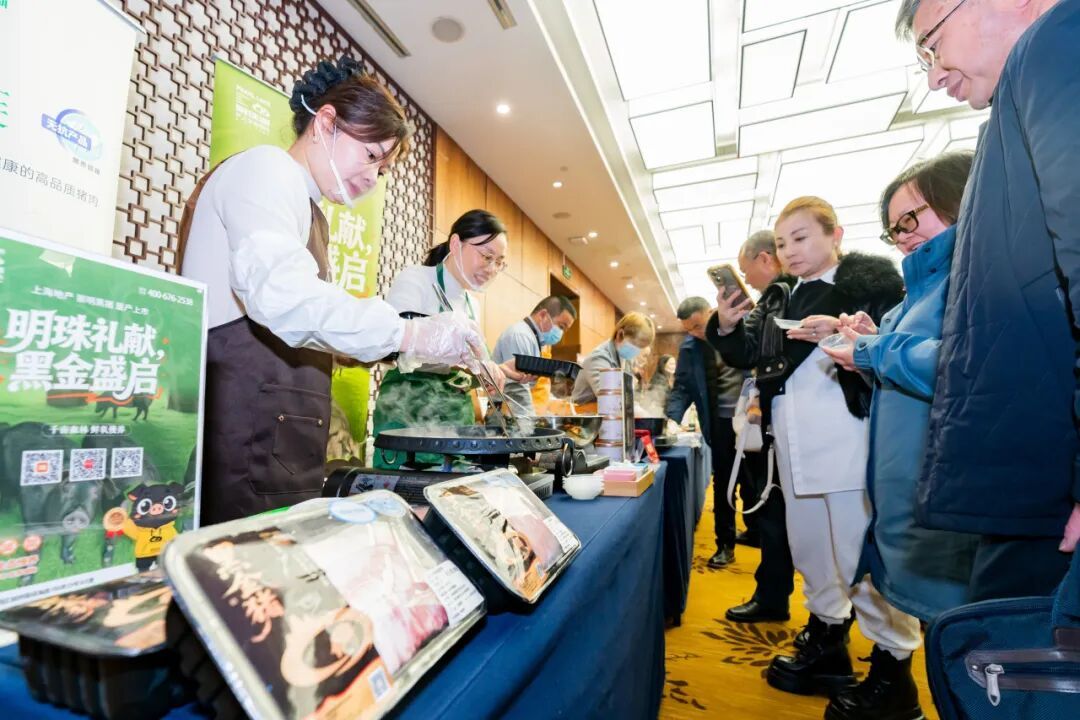 现场,知名主厨团队通过多元烹饪方式,凸显不同品种猪肉的独特风味,梅山猪白切肉,浦东白猪烹制的红烧肉,枫泾猪制成的枫泾丁蹄、沙乌头猪炒制的胡萝卜炒肉丝、上海白猪熬制的骨头汤等佳肴依次呈现,带来了一场色香味俱全的味觉体验。明珠湖肉食品、新鑫畜牧、恒健农牧、新邦优鲜等企业进行现场推介。采购单位与企业进行现场洽谈,进一步促进产销对接,拓展本土优质猪肉的市场渠道。