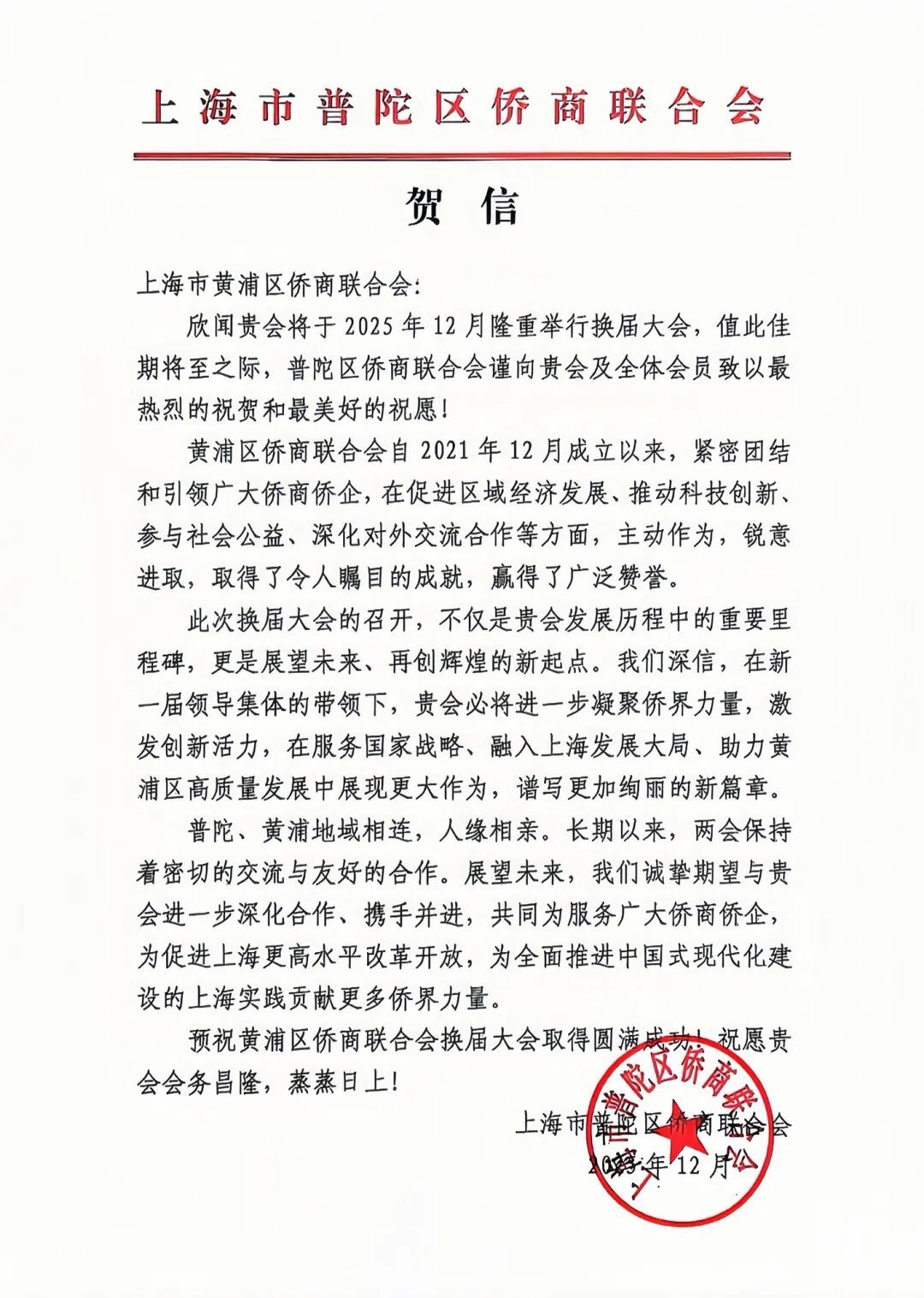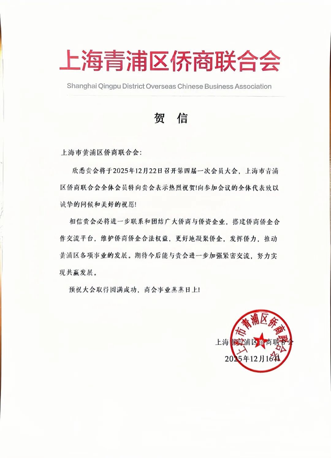 海内外友好社团中国旅美科技协会、澳大利亚上海总商会、南非上海共商联谊总会、泰国华人青年商会以及青浦、普陀区侨商会通过贺信、视频等形式送上祝福,传递了深化合作、共促发展的殷切期盼。