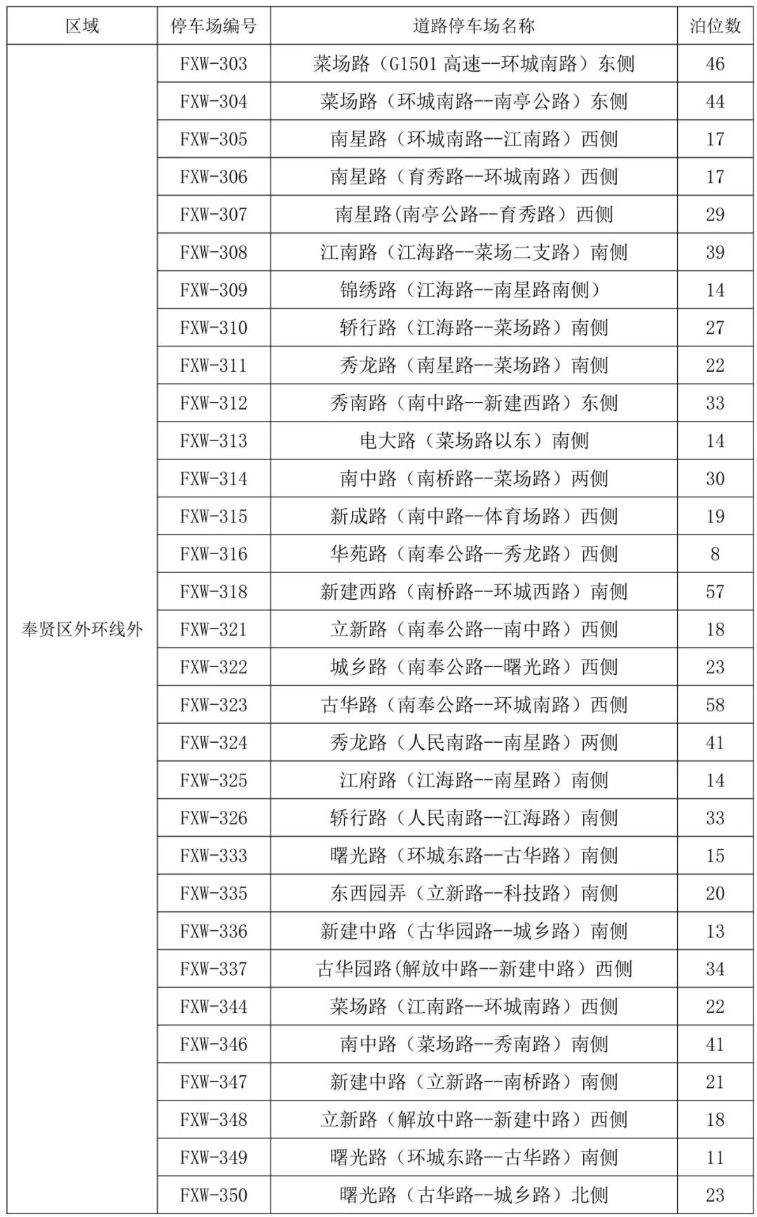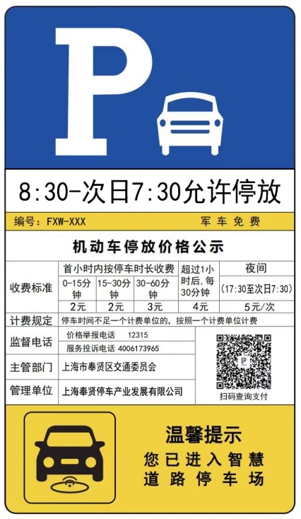 尊敬的各位车主: 自2025年12月30日零时起,奉贤区31处道路停车场将正式实施全市统一智慧收费管理,并同步提供道路停车错峰共享按月结算服务。(注:31处道路停车场周六、周日、法定节假日白天按次计费统一调整为按时计费)。 实施政府定价统一标准 根据市价格主管部门会同市财政部门核定的本市智慧道路停车场收费标准和计费规定(如下表),本区执行如下: 31处道路停车场实施全市统一 智慧收费管理 根据市、区公安交管部门核定,本次新增的31处智慧道路停车场具体设置信息如下: 注:具体允许停放时间详见现场道路停车收费标志牌 奉贤区智慧道路停车场服务电话 400-6173-965 智慧道路停车场停车注意事项 一、相关道路停车场的允许停放时间、收费标准和计费规则等信息详见设置在道路停车场两端的收费标志牌,也可以登录“上海停车”APP、“奉贤停车”微信公众号查询了解。 二、本次实施智慧收费管理的31处道路停车场为周边小区居民提供“错峰共享、按月计费”的便捷优惠服务(对于属于工作日夜间以及周六、周日、法定节假日全天的停车时段,按月计算和征收道路停车费,详细规则可登录“上海停车”APP、“奉贤停车”微信公众号查询了解)。 有需求的居民可登录“奉贤停车”微信公众号,在停车服务-道路月结页面绑定车牌、电话后实名预申请开通按月结算服务。该功能自12月30日起正式启用,市民可通过“奉贤停车”公众号查询是否申请成功。 注:开通按月结算前需缴清智慧道路停车历史欠费;预申请成功后,请保证该车辆在12月30日前无新的欠费记录,否则正式启用后按月结算可能无法生效。 三、您在智慧道路停车场停车离场后,可登录“上海停车”APP、“奉贤停车”微信公众号主动查询和支付停车费,也可在收到欠费提醒短信后的十五个工作日内,登录“上海停车”APP、“奉贤停车”微信公众号查询和补缴欠费。如您对欠费有异议,可以拨打我区道路停车场服务电话400-6173-965,也可在线提出异议申诉,我们将按照规定核实您的停车信息后予以答复。 四、对于逾期未按要求缴清欠费的违规行为,我区将按规定程序开展欠费催缴并视具体违规情节实施信用管理,相关执法部门可按照《上海市停车场(库)管理办法》的规定予以处罚。 五、为提供更加及时、准确的短信提醒服务,建议您主动登录“上海停车”APP、“奉贤停车”微信公众号补充或更新绑定准确的车牌号码和手机号码;为保障您的个人信息及资金安全,建议扫描后附二维码或者通过各主流应用市场等正规渠道下载使用“上海停车”APP、“奉贤停车”微信公众号,勿使用第三方聚合支付平台。 特此通告。 查询、缴费请扫上方二维码↑ 智慧道路停车场标志牌
