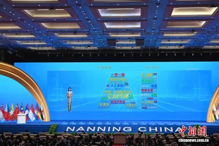 图为第22届中国—东盟博览会开幕式现场,由AI生成的大会热词。中新网记者 蒋雪林 摄