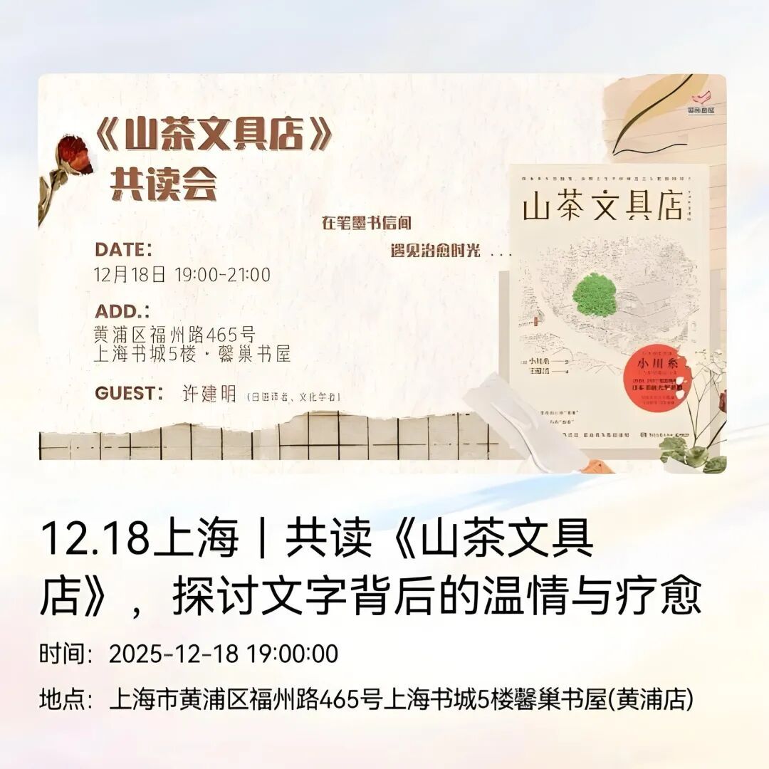最近,上海书城(福州路店)五楼馨巢书屋举办了一场“共读《山茶文具店》,探讨文字背后的温情与疗愈”分享活动,一起来听听现场读者的阅读感悟吧~