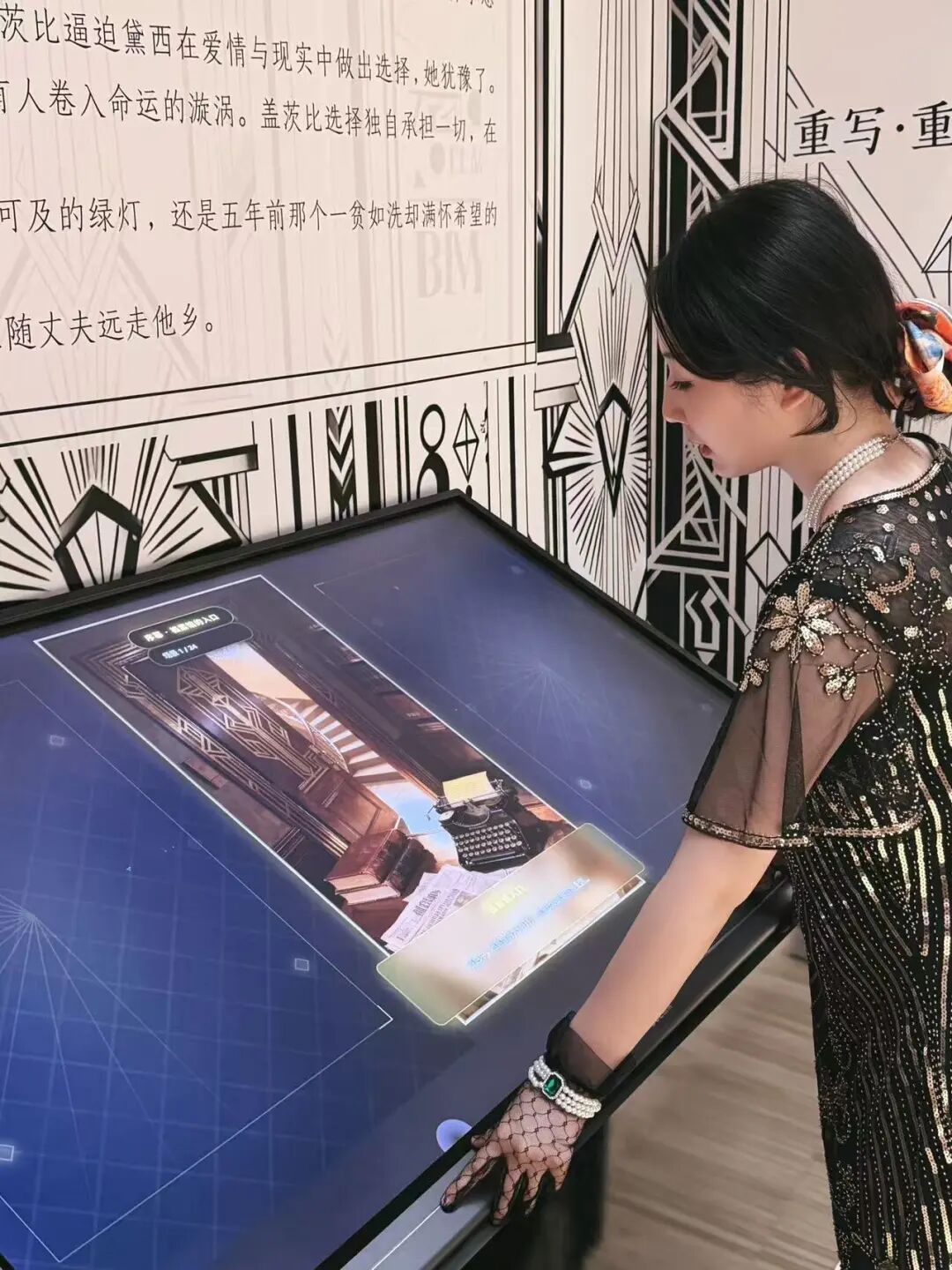 今天,猫头鹰眼镜男将作为展览的数字人,带你去逛逛盖茨比的宴会厅,手把手教你体验好玩的互动装置。