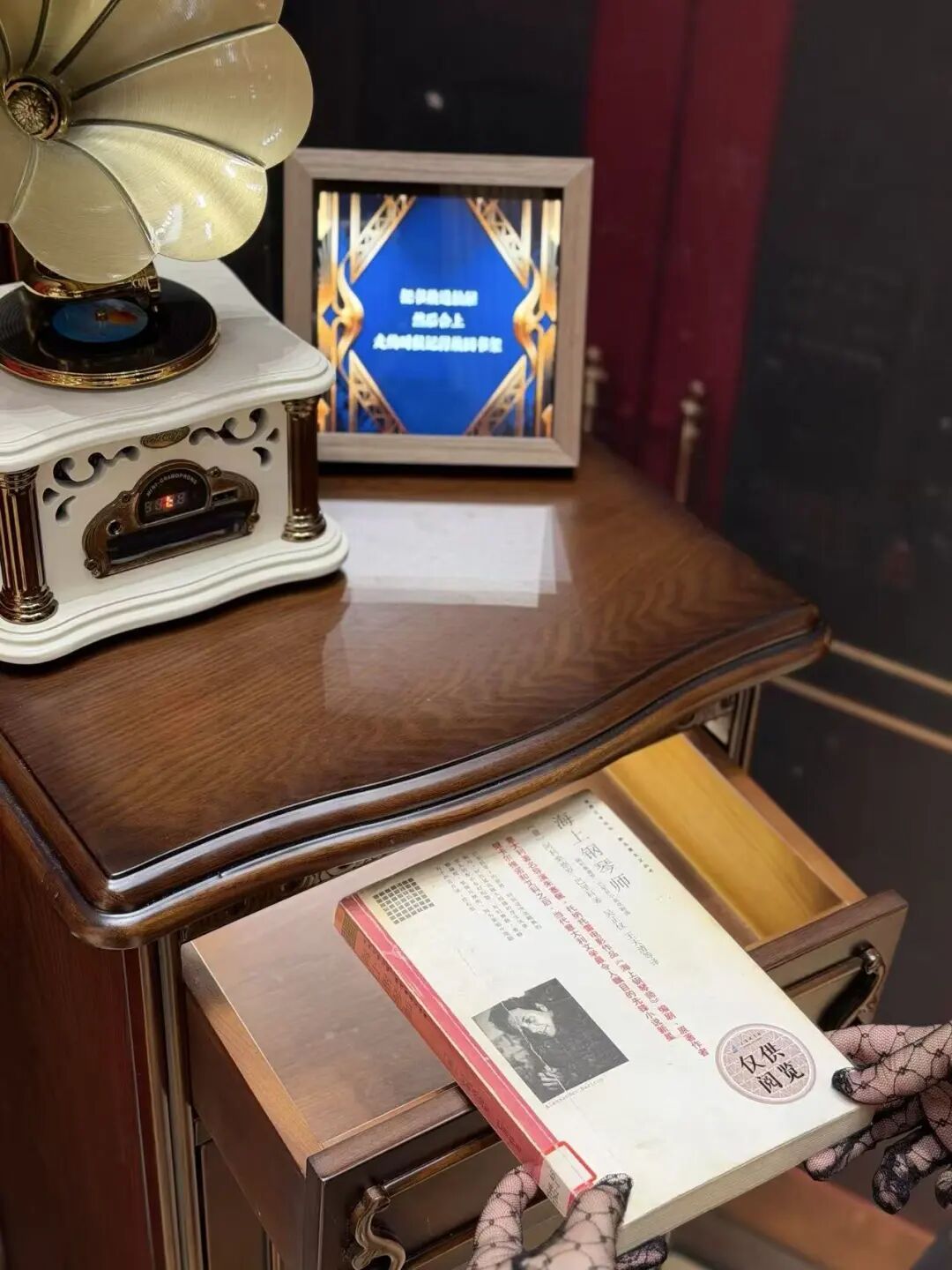 从留声机柜旁挑选一本您喜爱的图书,然后轻缓地拉开抽屉,将图书以正面朝上的方式平稳放入抽屉内,合上。此时,留声机便会自动识别你放入的书籍,播放与这本书相关的音乐。