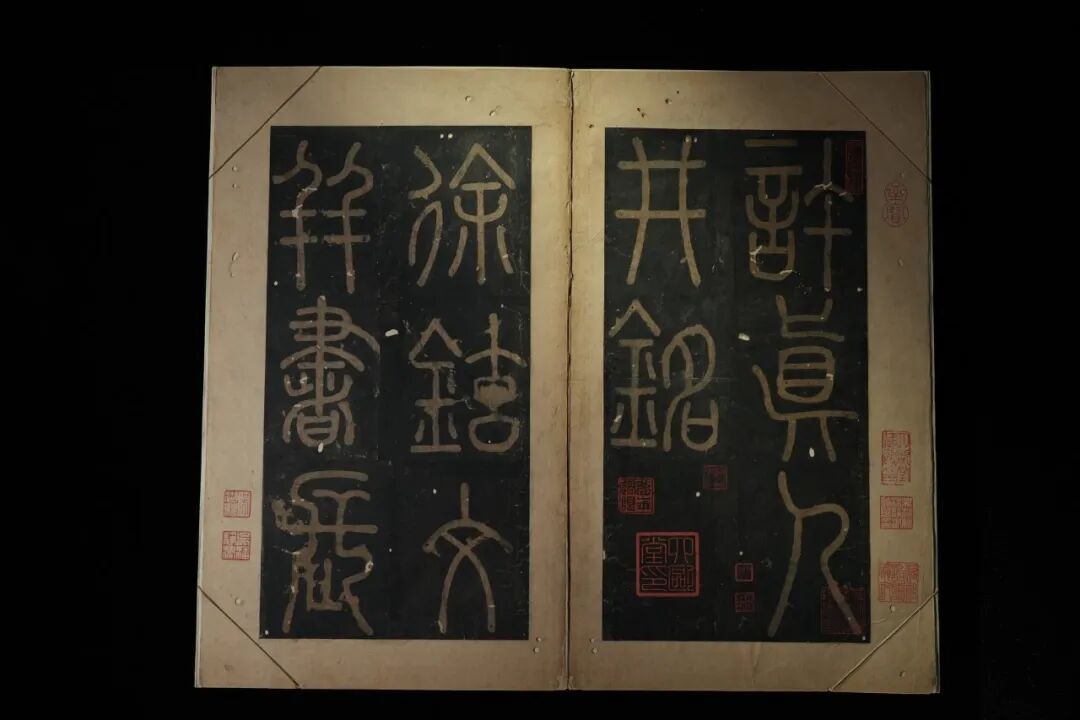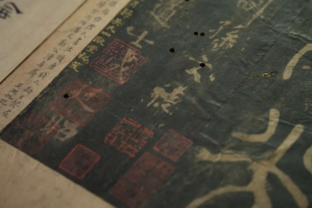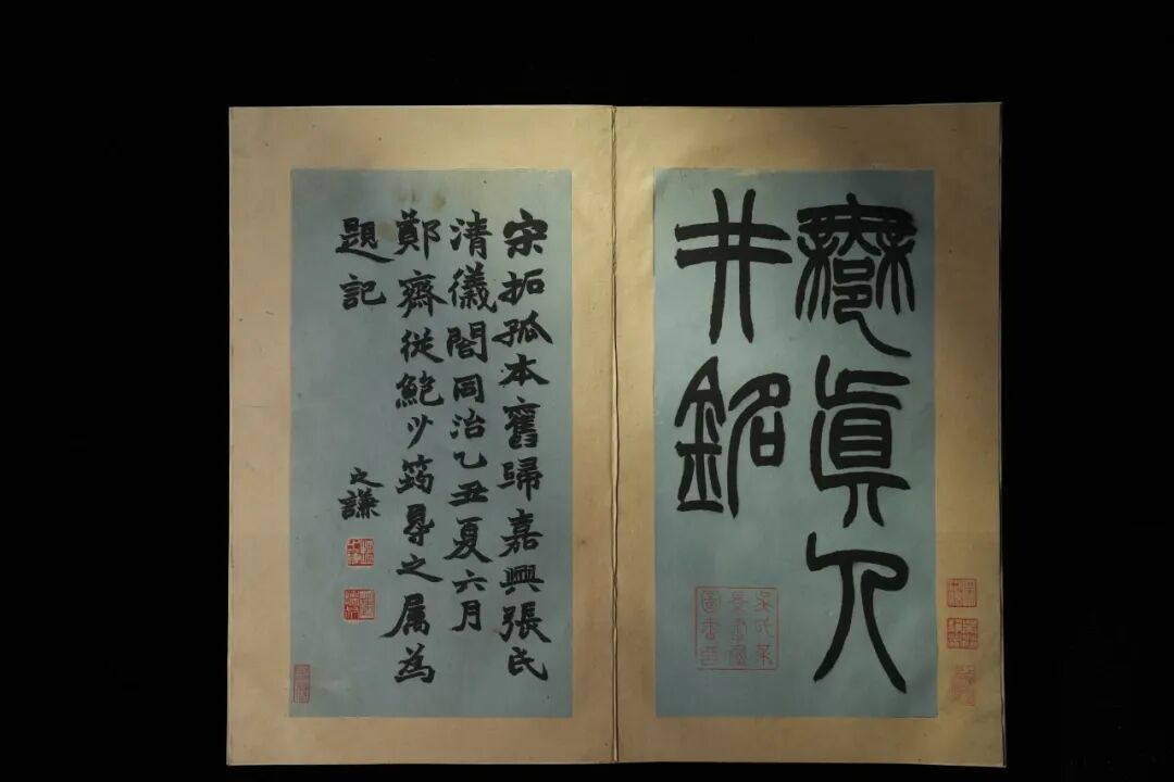 “宋装”就是指宋代的装帧形式。我们能看到,宋代的《井铭》原拓被逐页固定在了新制的经折底册之上,拓本内页的中心对折处和四角分别加了金色的丝线固定,没有去修补虫蛀孔洞,也没有加裱褙,为的就是在加固和保护的同时原汁原味地留下宋装本来的模样。所以,今天所见拓本内部,无论是黑色的帖芯还是周围一圈的裱纸,全都是宋代原物。另外,拓本首尾加装了面板,再配上蓝色书衣,在保存内部宋装的同时,又使它看上去面目一新,变得厚重而富丽,体现了吴湖帆作为一个“装帧达人”,重视书籍装帧潢中文化传承的理念。