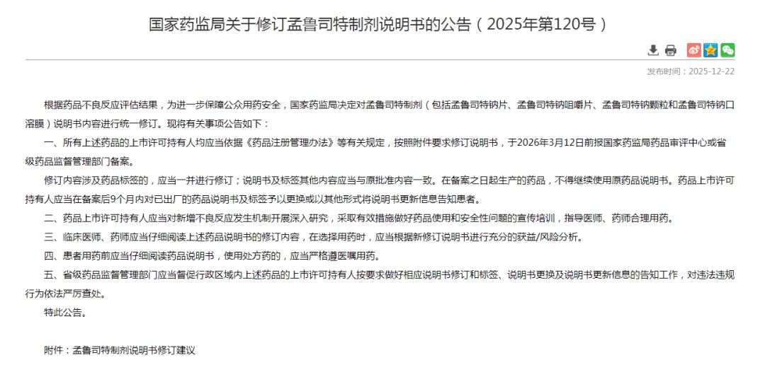 12月22日,国家药监局关于修订孟鲁司特制剂说明书的公告(2025年第120号)根据药品不良反应评估结果,为进一步保障公众用药安全,国家药监局决定对孟鲁司特制剂(包括孟鲁司特钠片、孟鲁司特钠咀嚼片、孟鲁司特钠颗粒和孟鲁司特钠口溶膜)说明书内容进行统一修订。
