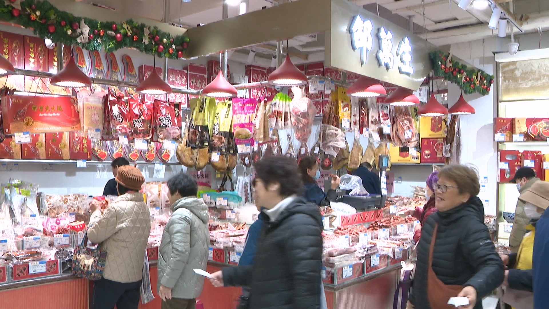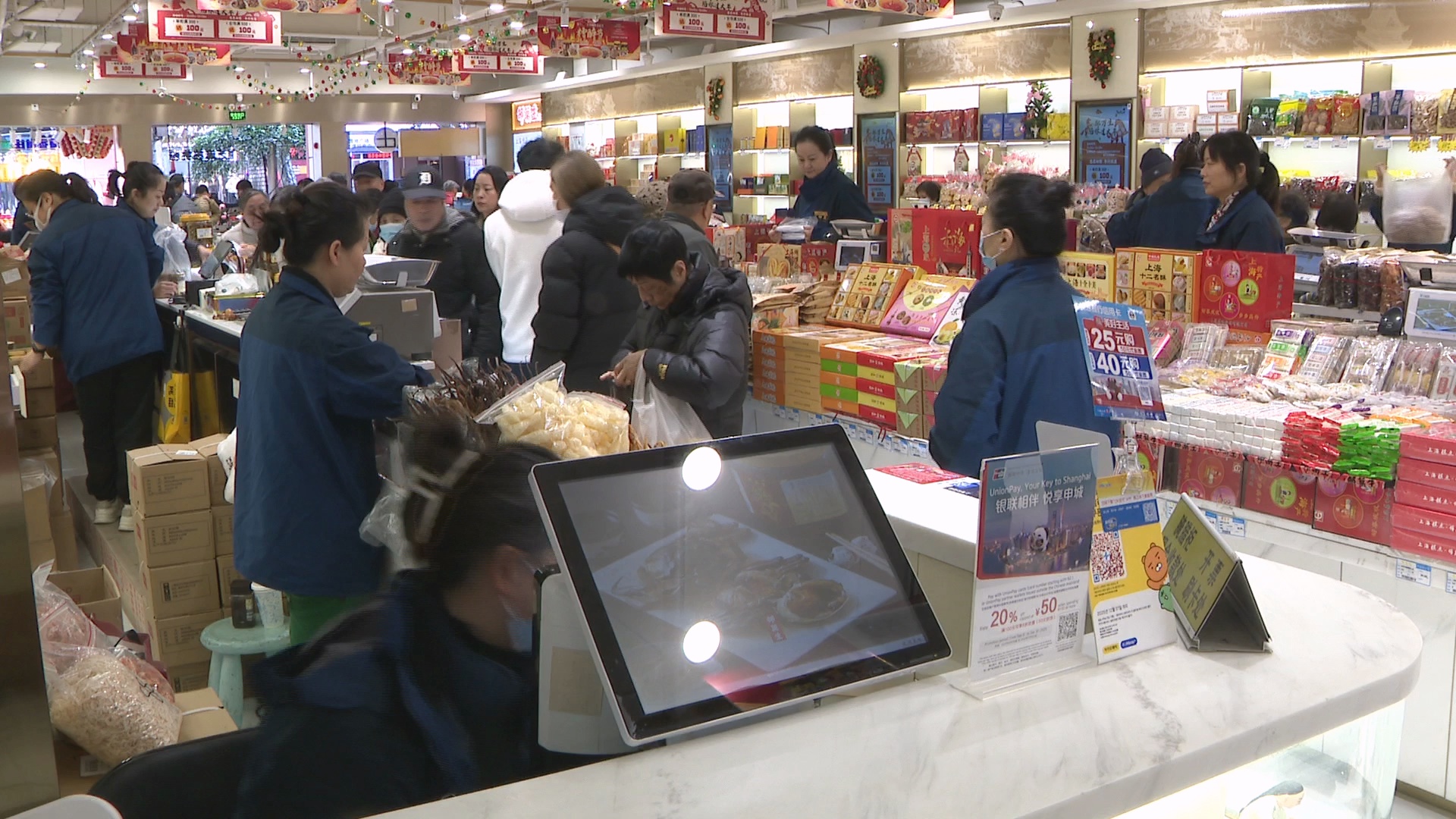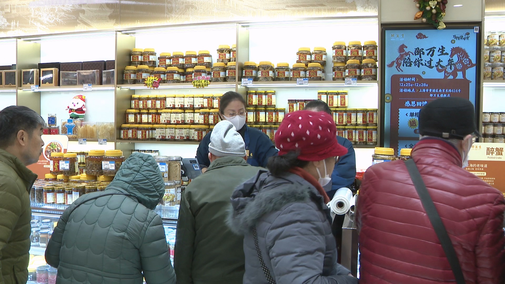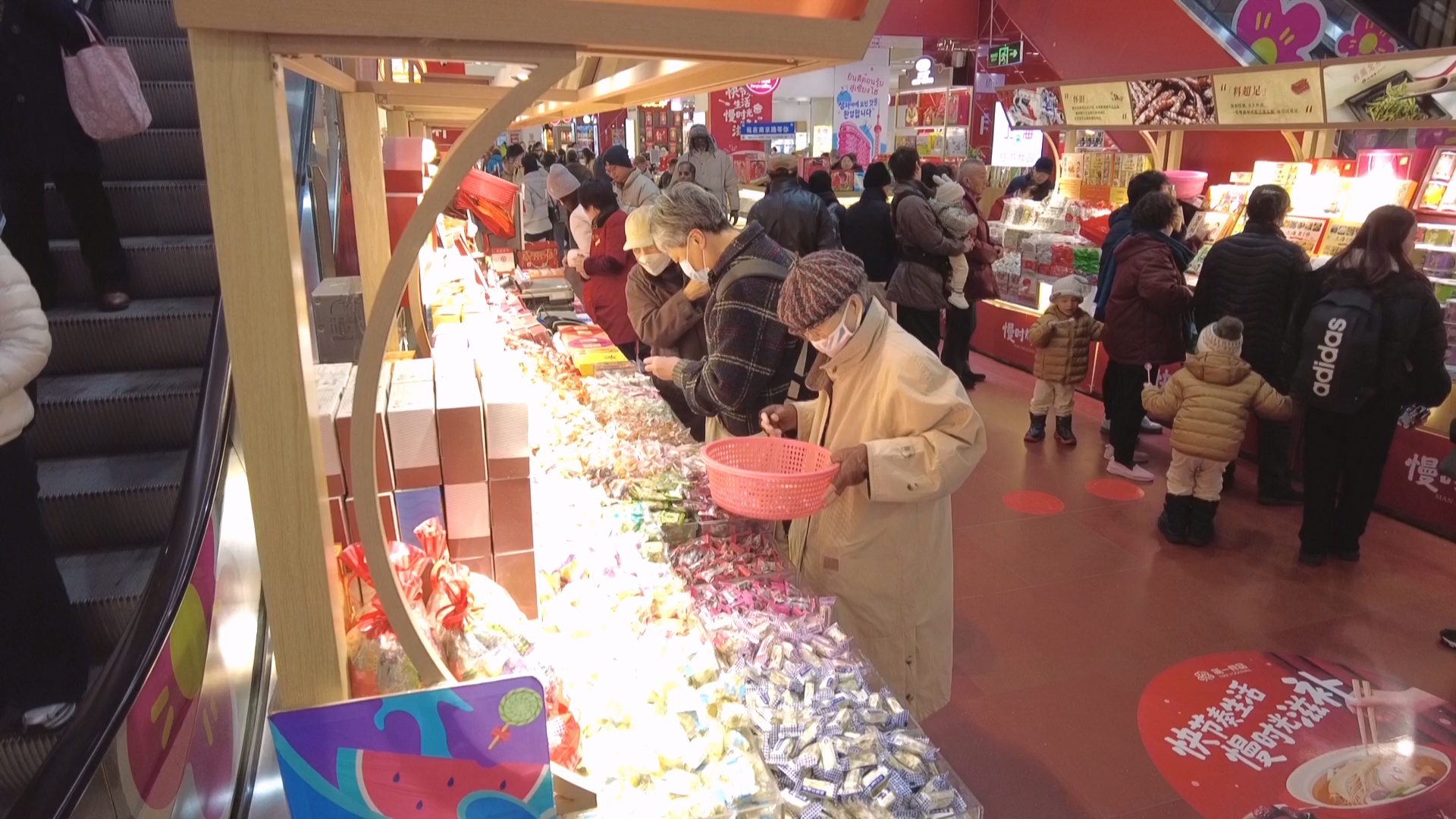 在第一食品南东店,市民游客也是熙熙攘攘,他们各自选购中意的食品,希望新年在走亲访友之间能够用得上。