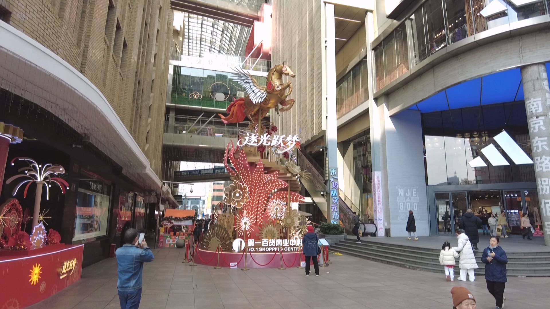 上午,记者在南京路步行街看到,尽管由于冷空气来临,气温降至个位数,但街上的市民游客依旧人头攒动,不少游客都是拖着行李箱直奔步行街而来。明年是中国传统的生肖马年,飞马造型的迎新装置已经摆放在街头,引得市民游客纷纷拍照留念。
