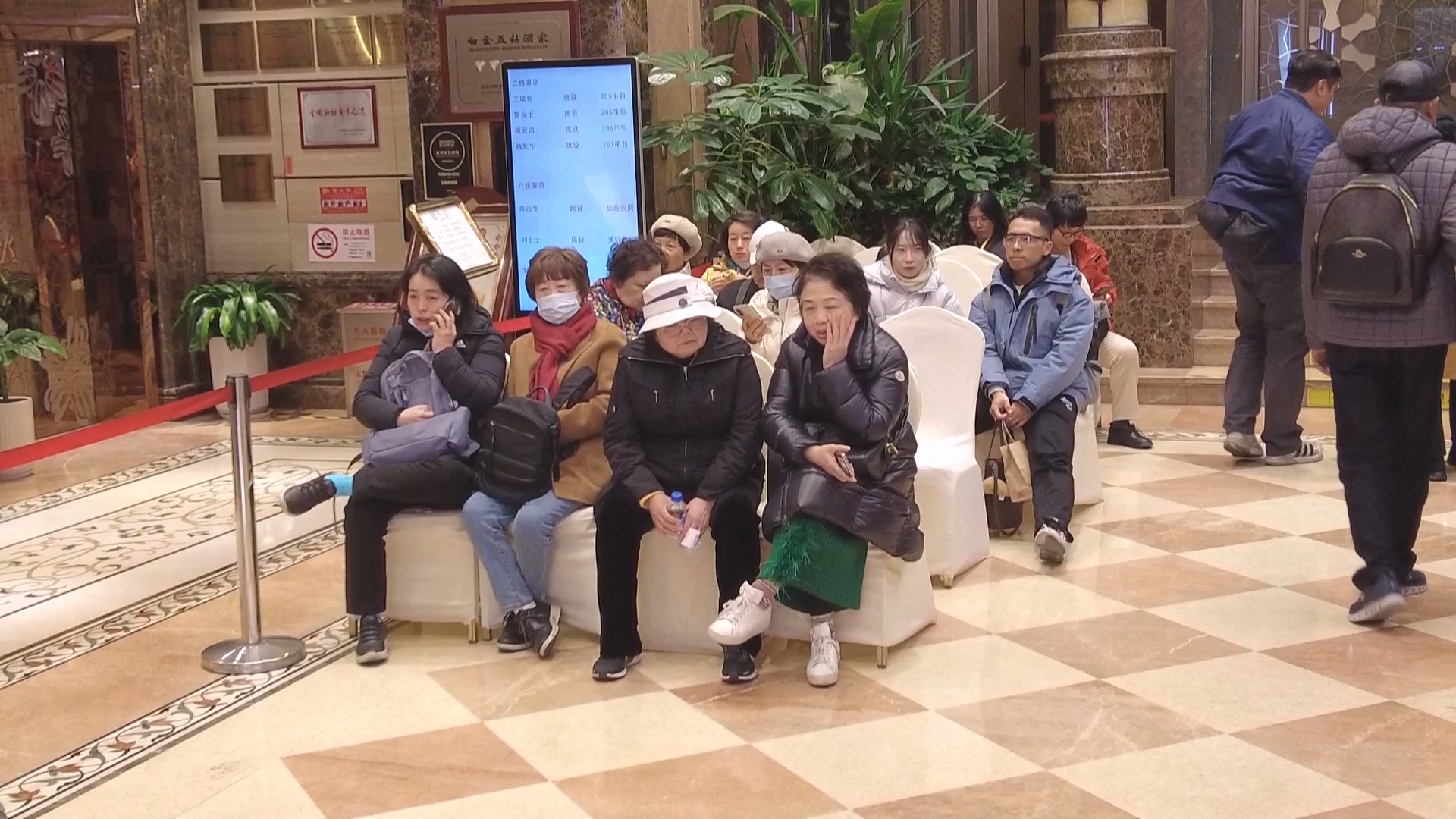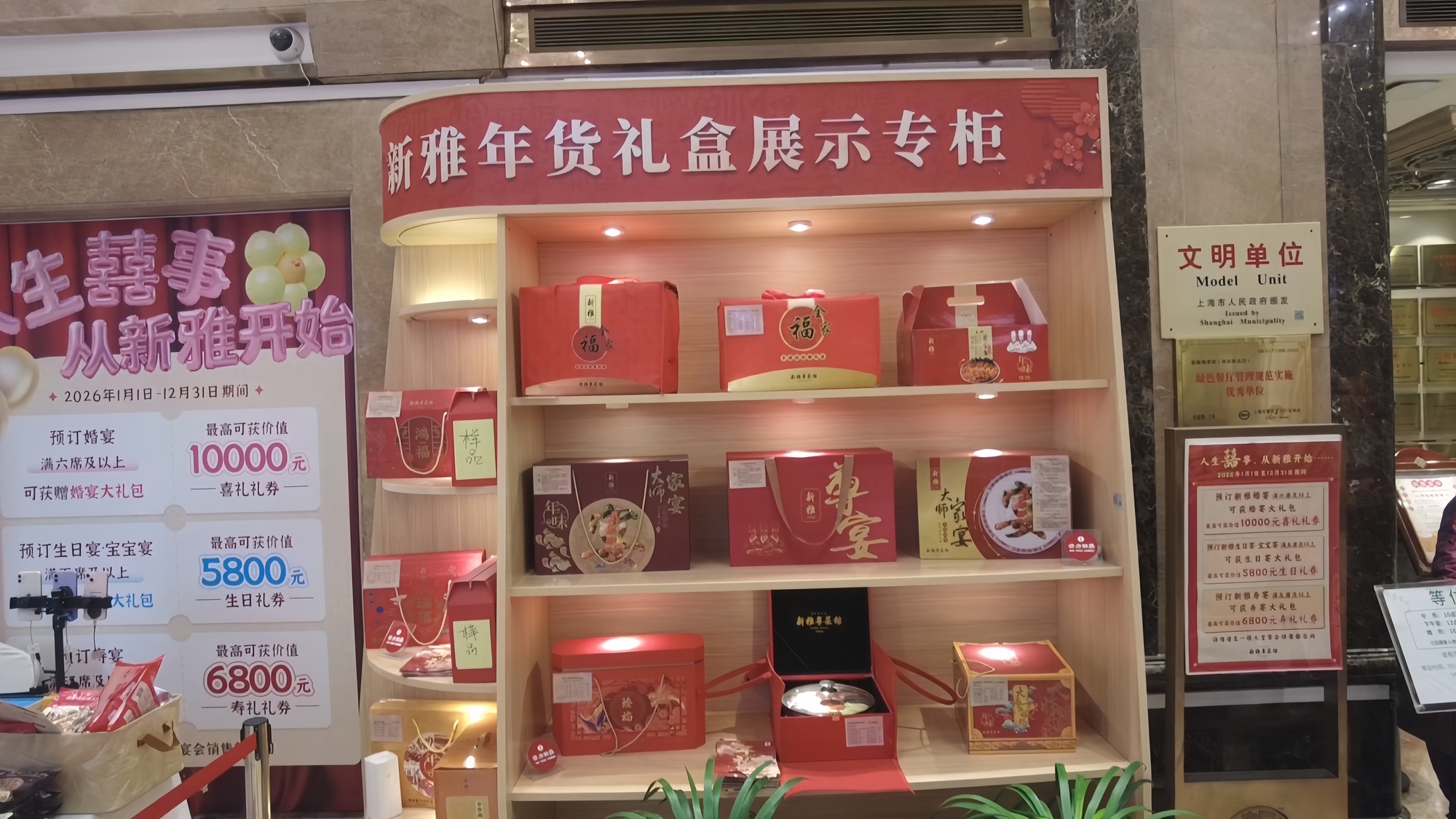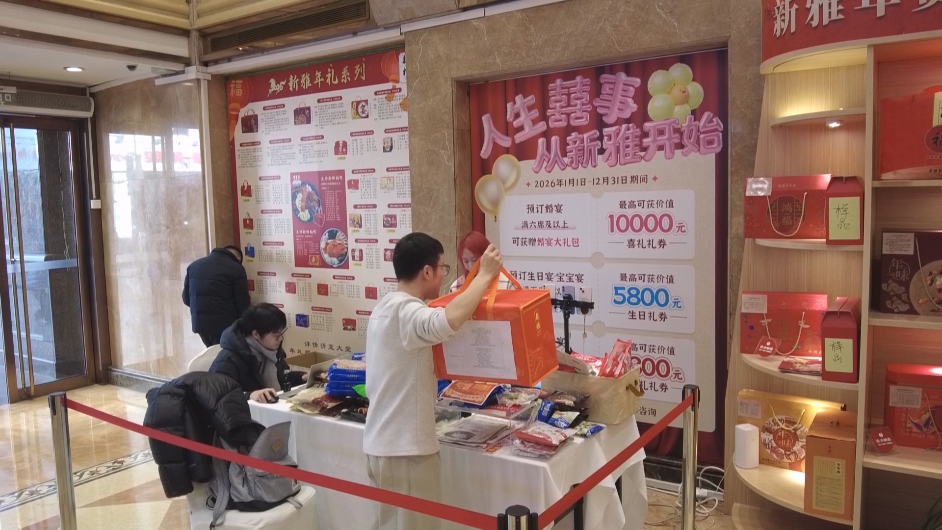 在新雅粤菜馆,大厅里线上直播带货正在热闹进行中,新年各种半成品礼盒也已经摆放在陈列货架上,等候区内,准备就餐的市民游客已经有不少在等位。