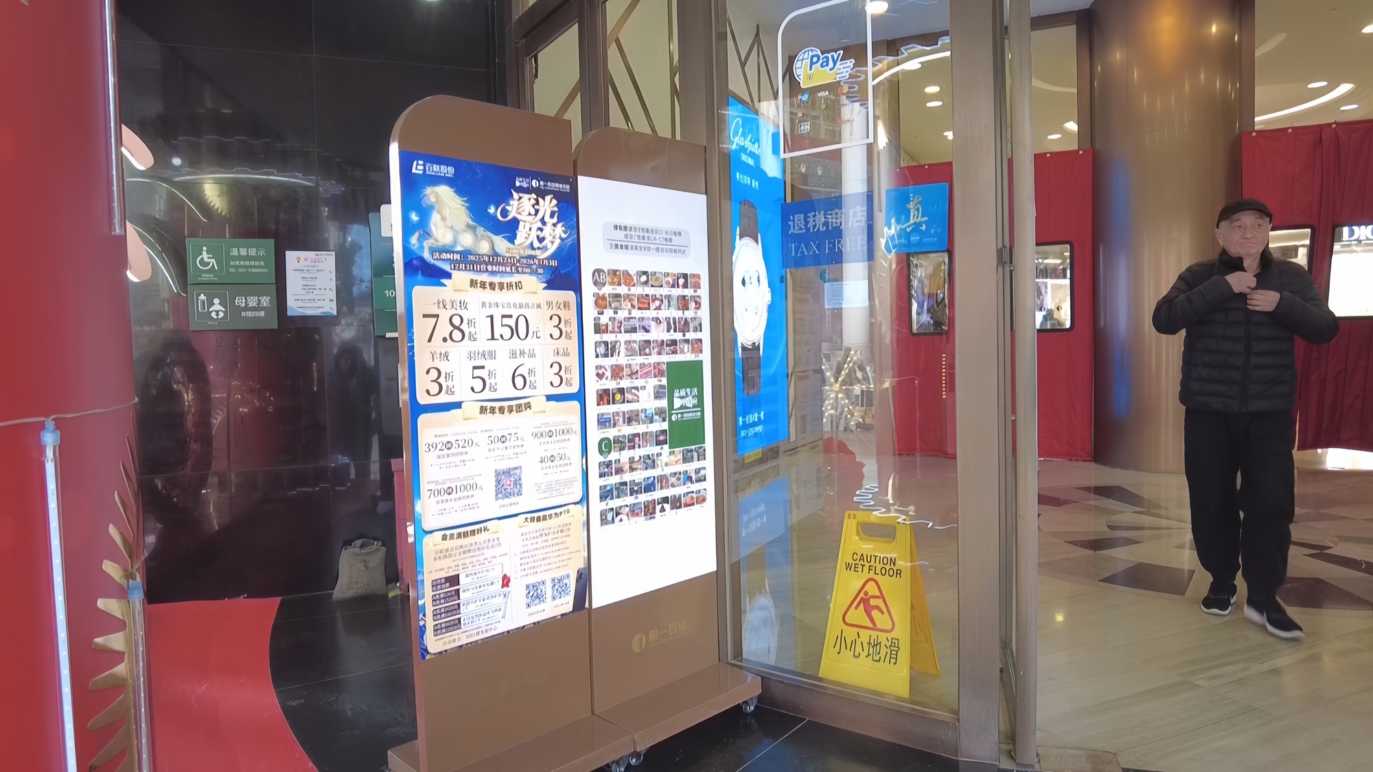 在第一百货商业中心,跨年延长营业时间的提示已经醒目地摆放在商厦门口,各种跨年促销活动也从今天开始,优惠力度也是蛮大的。