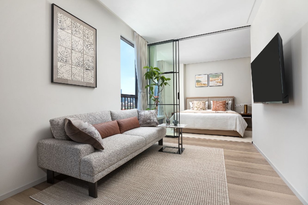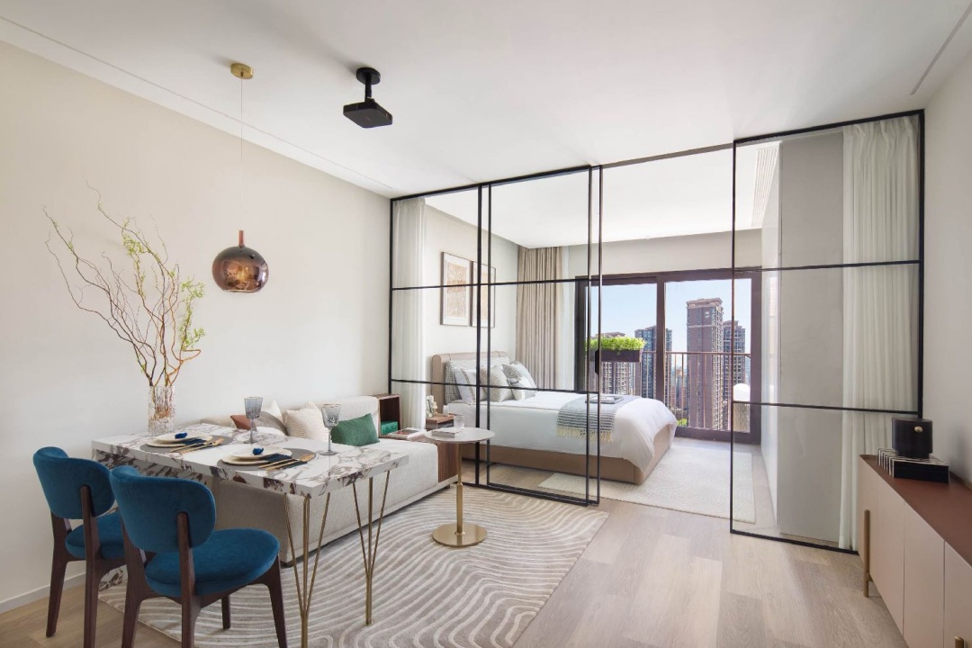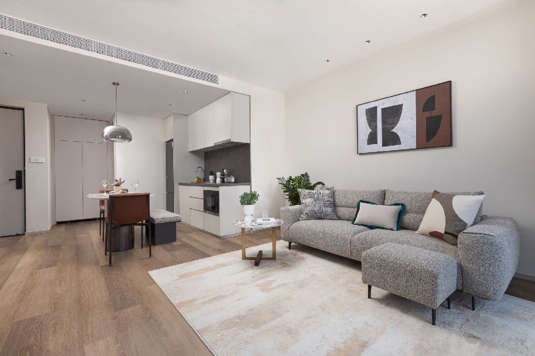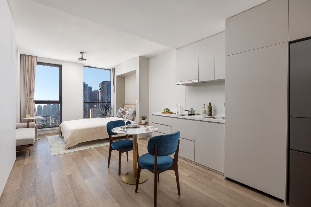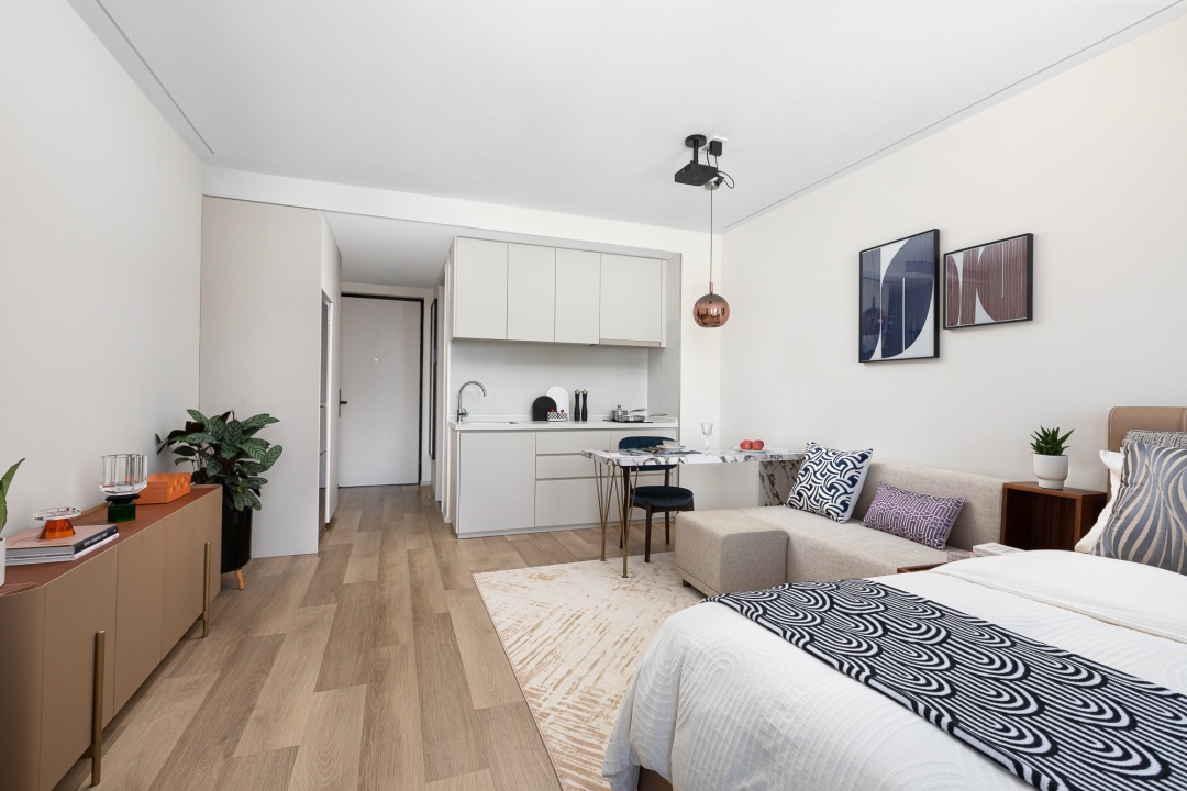 拥有一房式公寓(51—86平方米)和两房式公寓(108平方米)多类户型,套内配备Murphy折叠床、高清投影仪、洗烘一体机、中央空调、大尺寸冰箱、设备齐全的厨房、阳台、步入式衣帽间等。此外,租金还包含一周一次客房打扫、布草毛巾更换、共享宽带&WIFI、公共空间及健身房24小时使用、物业管理费等设施服务。