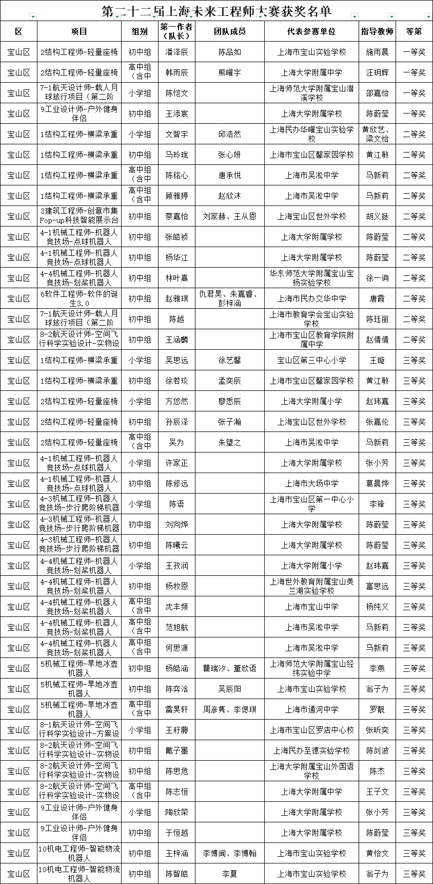 第22届上海未来工程师大赛获奖名单(宝山区)
