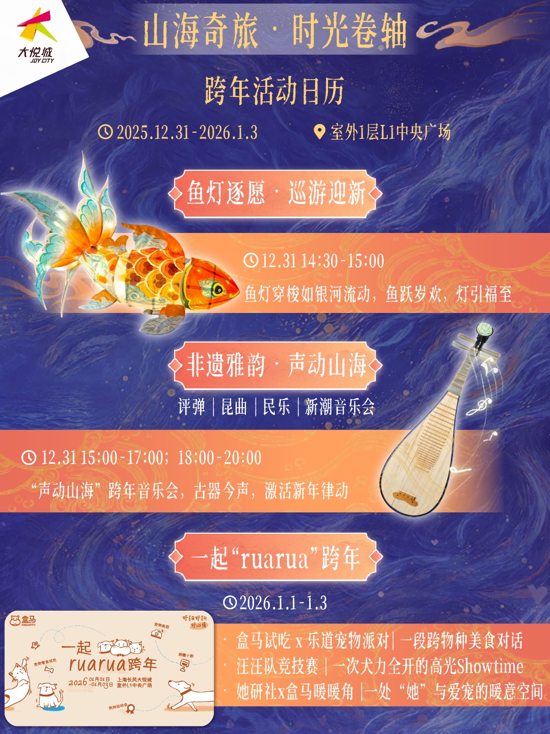 山海不远,就在身边。本次跨年活动以《山海经》文化为底蕴,通过分阶段陆续展开的光影艺术场景、非遗演出、宠物社交与消费礼遇,致力于为市民游客提供一场集视觉、听觉、互动与购物于一体的综合性跨年体验。