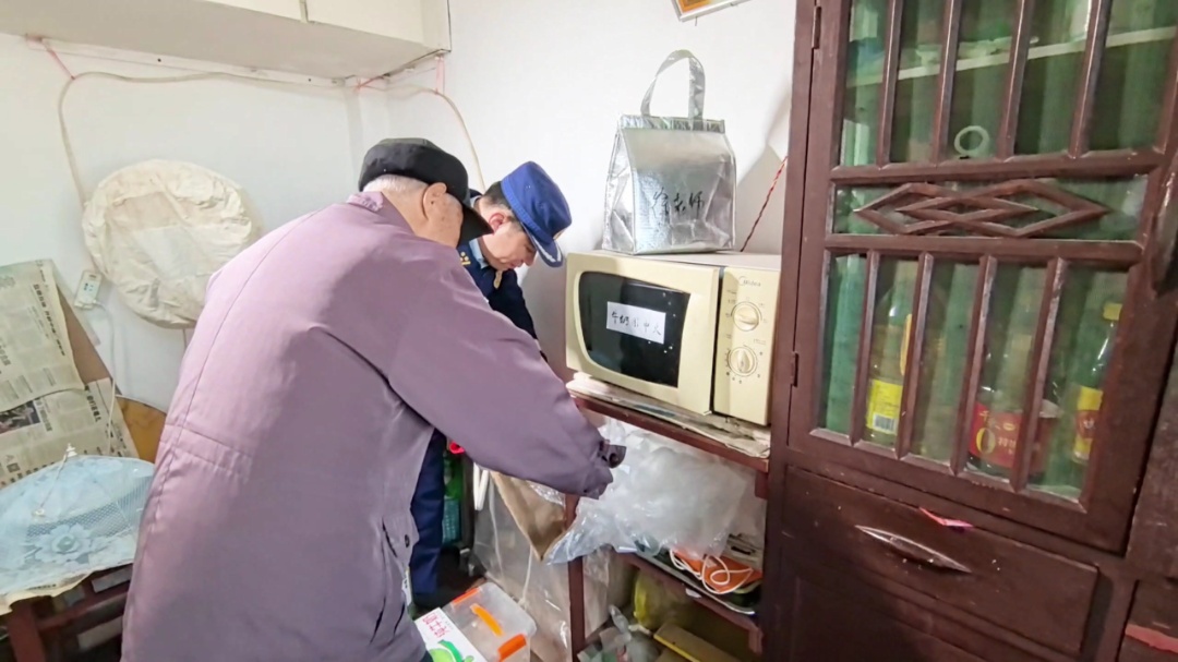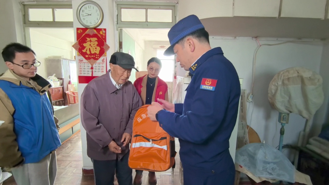随后,检查人员与消防志愿者为老人替换了全新的拖线板,并要求物业人员后续上门为老人检查全屋线路,确保日常用电安全。此外检查人员还为独居老人发放了应急救援包,并耐心讲解了各类器具的具体使用方法。