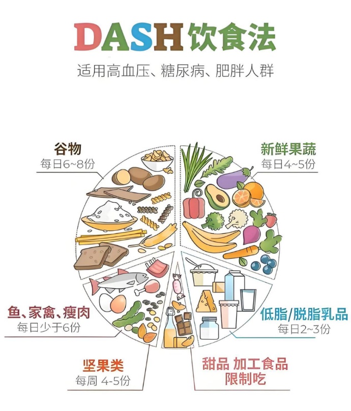 提倡多摄入水果、蔬菜,这类食物富含钾、镁、维生素、膳食纤维、抗氧化物质、植物化学物,因为蔬菜和水果中的膳食纤维能帮助结合部分脂肪和胆固醇,促进排出。建议每天吃500克以上蔬菜,优先选绿叶菜、西兰花、芹菜等,深色蔬菜占一半以上;水果选低糖款(苹果、柚子、蓝莓等),每天200—350克,避免果汁和果干,减少额外糖分摄入。