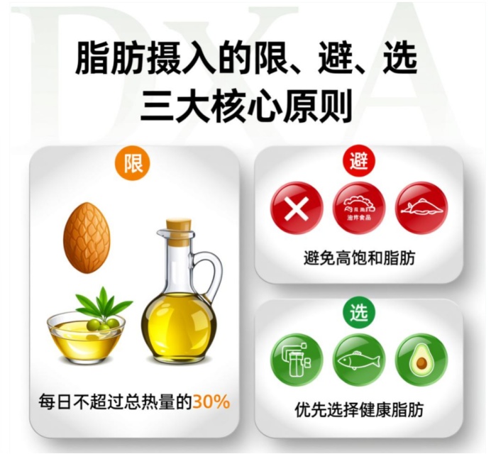 “限”:减少脂肪的摄入。膳食脂肪是影响血脂最重要的营养因素,日常脂肪摄入不应超过总能量的20%~30%。膳食中反式脂肪酸提供的能量应小于每日摄入总能量的1%。