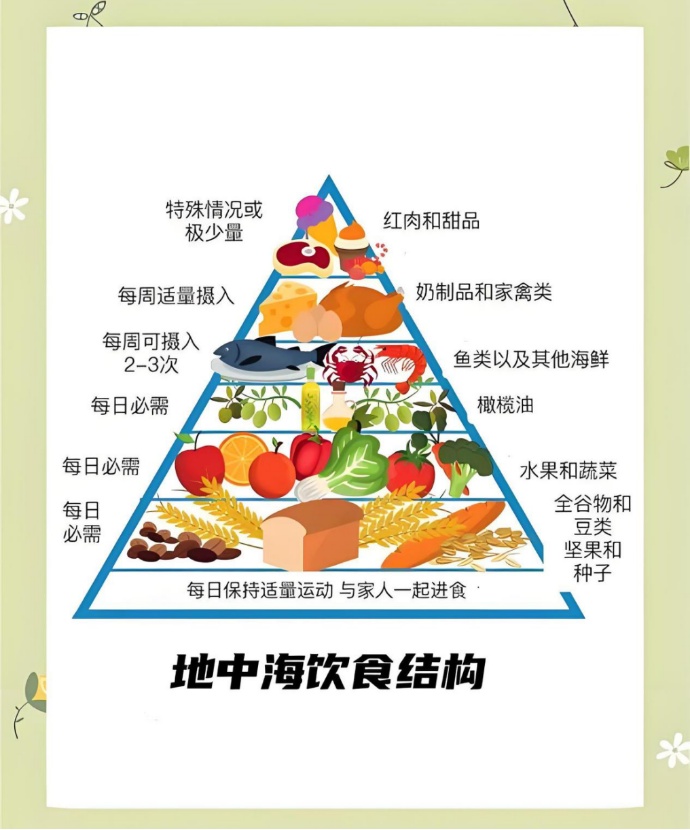 地中海膳食和DASH膳食模式具有改善血脂异常的作用,建议按照这两个膳食模式,增加蔬菜、水果、全谷类、豆类、坚果类食物和橄榄油(橄榄油虽好,但仍需控制用量,避免因热量过高导致体重增加)的摄入,每周至少摄入2次海产品(鱼、虾、蟹、贝类),适量摄入禽肉、乳制品;烹饪时用植物油来代替动物油,提倡用橄榄油和茶油;食物的加工程度尽可能低,烹饪时应避免煎、炸、烤等方法。