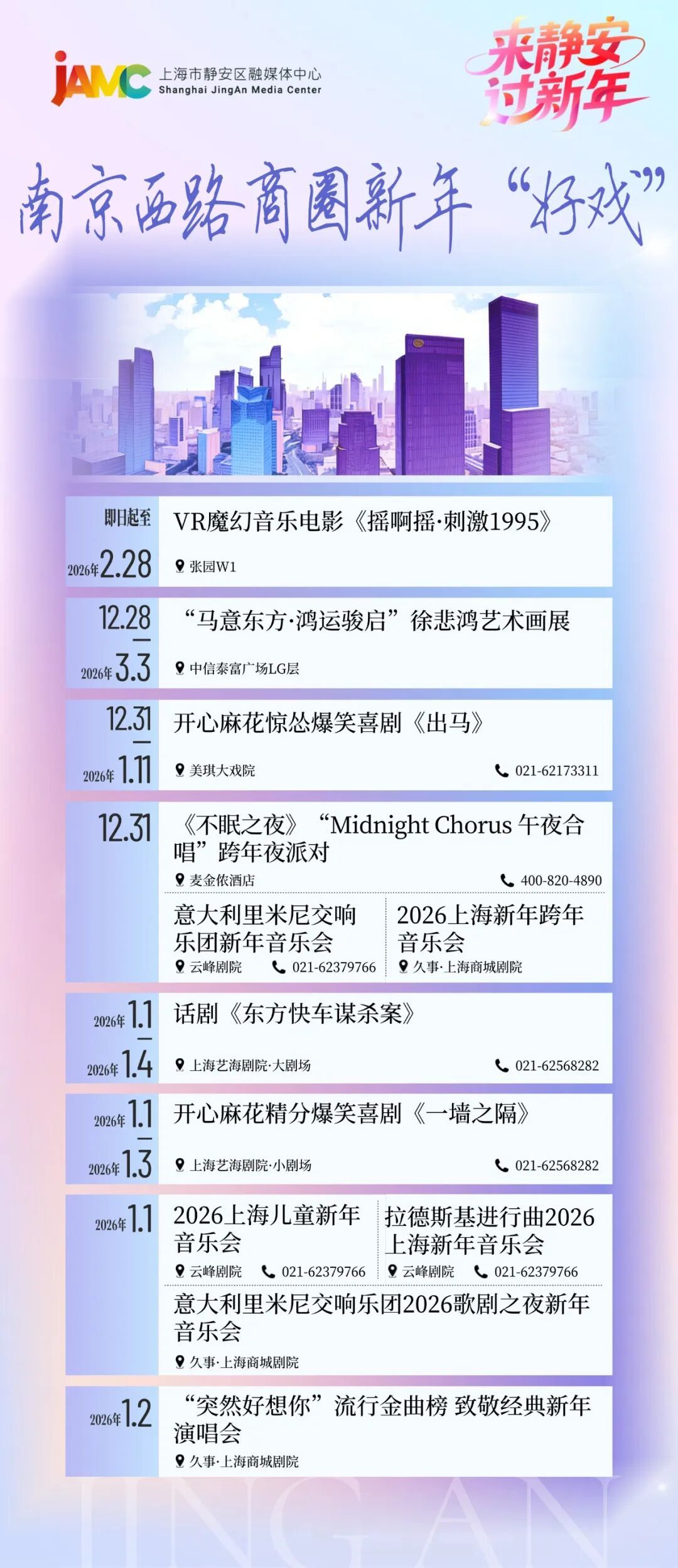 你可以来到张园观看VR魔幻音乐电影《摇啊摇·刺激1995》; 在中信泰富广场看“马意东方·鸿运骏启”徐悲鸿艺术画展; 在麦金侬酒店参加《不眠之夜》“Midnight Chorus午夜合唱”跨年夜派对; 在美琪大戏院观看开心麻花惊怂爆笑喜剧《出马》; 在上海艺海剧院看话剧《东方快车谋杀案》、开心麻花精分爆笑喜剧《一墙之隔》; 在云峰剧院听2026意大利里米尼交响乐团新年音乐会、2026上海儿童新年音乐会、拉德斯基进行曲2026上海新年音乐会; 在久事·上海商城剧院听2026上海新年跨年音乐会、意大利里米尼交响乐团2026歌剧之夜新年音乐会、“突然好想你”流行金曲榜 致敬经典新年演唱会…… *更多惊喜,点击海报放大查看↓↓↓