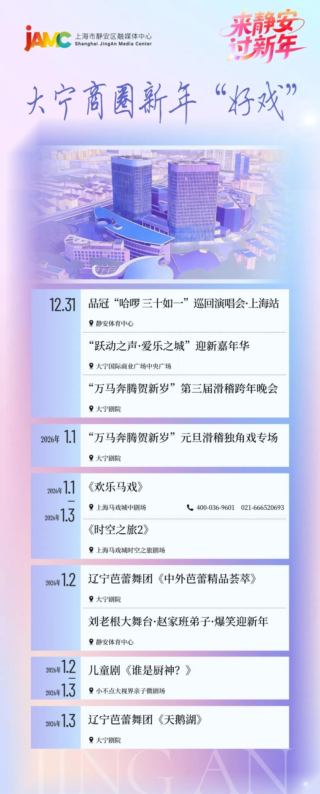 新年的脚步越来越近,跨年的安排想好了吗?在静安,精彩的演出、丰富的剧目在南京西路商圈、苏河湾商圈、大宁商圈纷纷上演,伴你尽情享受迎新假期,一起来看吧~