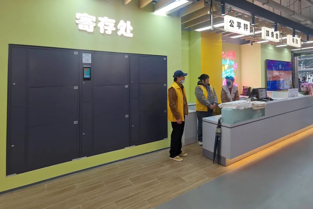 位于菜市场入口处的开放式服务台,在保留传统菜市场校秤服务的同时,还增加了购物咨询、处理投诉纠纷、寄存柜、借用轮椅、购物推车和雨伞等人性化便民服务项目,随时为有需要的顾客提供帮助。服务台一侧的九个超大号寄存柜尤其醒目。
