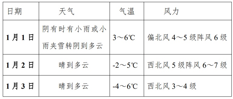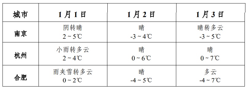 2025年的最后一天,上海云系较多。上午起寒潮天气跨年而来,本市将出现大风、明显降温和弱雨雪天气过程。明天白天最高气温尚有11℃,夜间气温在8℃以下,跨年夜户外活动请注意防寒保暖。 12月31日天气情况:多云到阴,傍晚前后转阴到多云局部地区有短时小雨。东北风5级阵风6-7级,沿江沿海地区5-6级阵风7级。全天气温在8℃-11℃之间。 元旦期间 嘉定受寒潮影响 有明显降温、大风和弱降水天气 详见↓ 明显降温:12月31日上午起强冷空气开始影响我区,预计48小时(12月31日-2026年1月2日)最低气温降幅可达8℃。2日早晨最低气温零下2℃,有薄冰;3日早晨最低气温零下4℃,有冰冻。 大风:31日到2日最大阵风6-7级,3日白天风力明显减弱。 降水:1日白天阴有时有小雨,局部地区可能出现短时雨夹雪或零星小雪。1日夜间至2日早晨,低洼路面和桥梁可能出现轻微道路结冰现象。 长三角城市天气预报 ↓↓↓ 元旦假期,长三角大部地区将出现明显降温、大风和弱降水过程,1日以小雨或雨夹雪为主,2日和3日天气晴冷。 防寒保暖 气温骤降,早晚寒意更浓,请及时添衣保暖,注意预防呼吸道和心脑血管疾病。 注意交通安全 元旦当天有弱降水,道路湿滑,1日夜间至2日早晨郊区低洼路面和桥梁可能出现轻微道路结冰现象,出行请注意交通安全。 防范大风 请及时收起易受大风影响物品。大风预警期间勿在临时搭建物附近逗留,防范高空坠物。大风对水上交通有一定影响,及时留意最新交通信息。