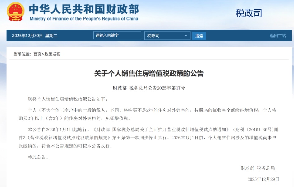 本公告自2026年1月1日起施行。《财政部 国家税务总局关于全面推开营业税改征增值税试点的通知》(财税〔2016〕36号)附件3《营业税改征增值税试点过渡政策的规定》第五条第一款同步停止执行。2026年1月1日前,个人销售住房涉及的增值税尚未申报缴纳的,符合本公告规定的可按本公告执行。
